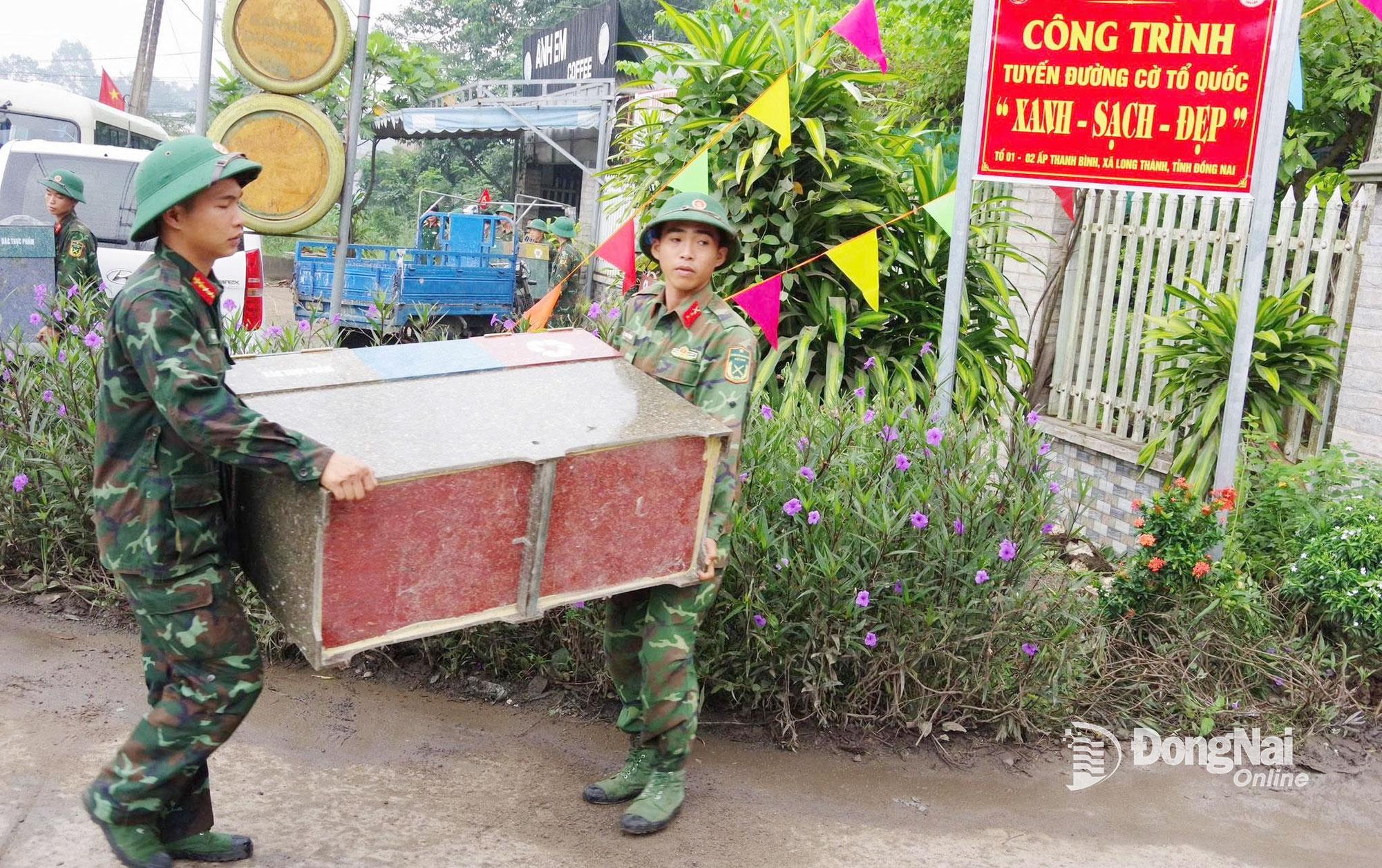 | Cán bộ, chiến sĩ Trường trung cấp Kỹ thuật Tăng thiết giáp phân hiệu miền Nam phối hợp làm dân vận tại xã Long Thành. Ảnh: ĐVCC |