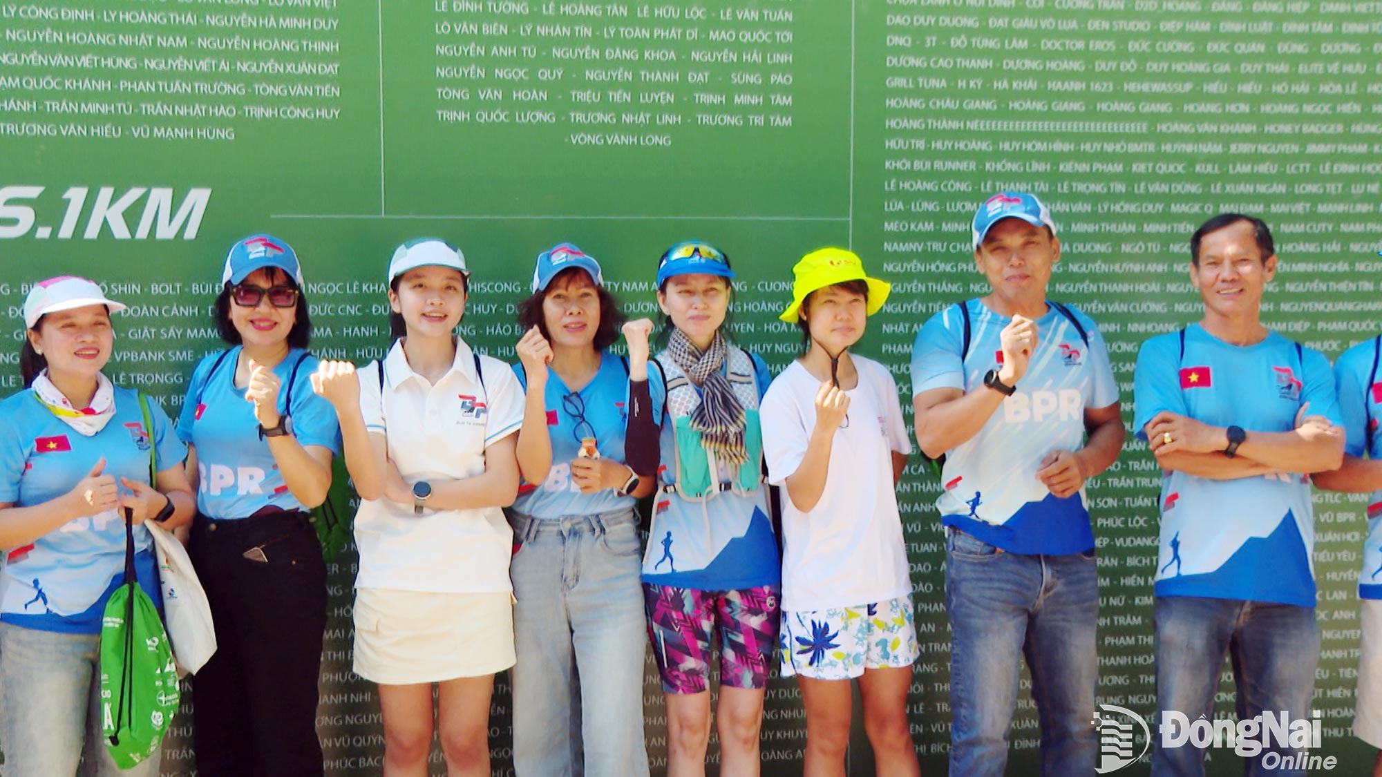 | Chị Trần Thị Lê (bìa trái) và em Khổng Trần Gia Hân (thứ 3 từ trái sang), cùng Câu lạc bộ Bình Phước Runners chụp ảnh lưu niệm. Ảnh: Công Nghĩa |