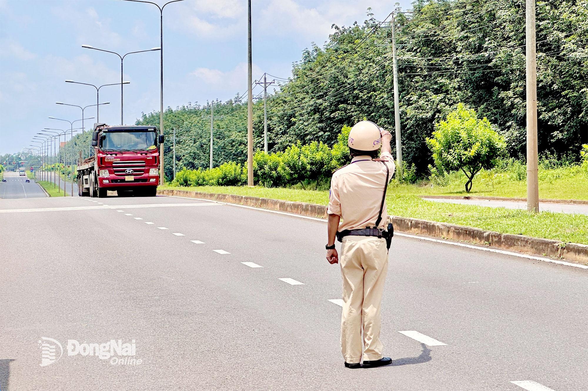 | Lực lượng cảnh sát giao thông kiểm soát các phương tiện di chuyển trong khu công nghiệp Long Khánh. Ảnh: Đăng Tùng |