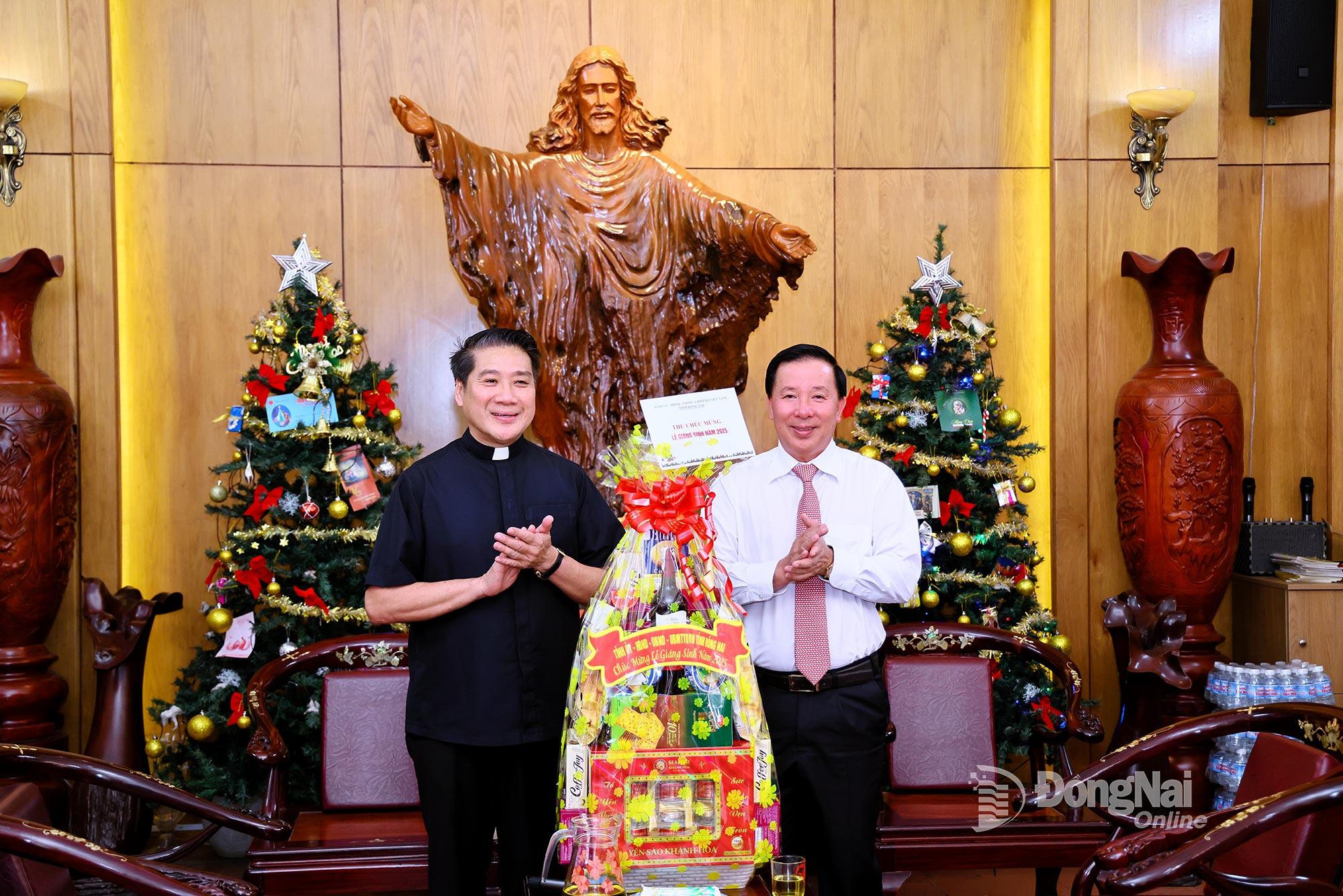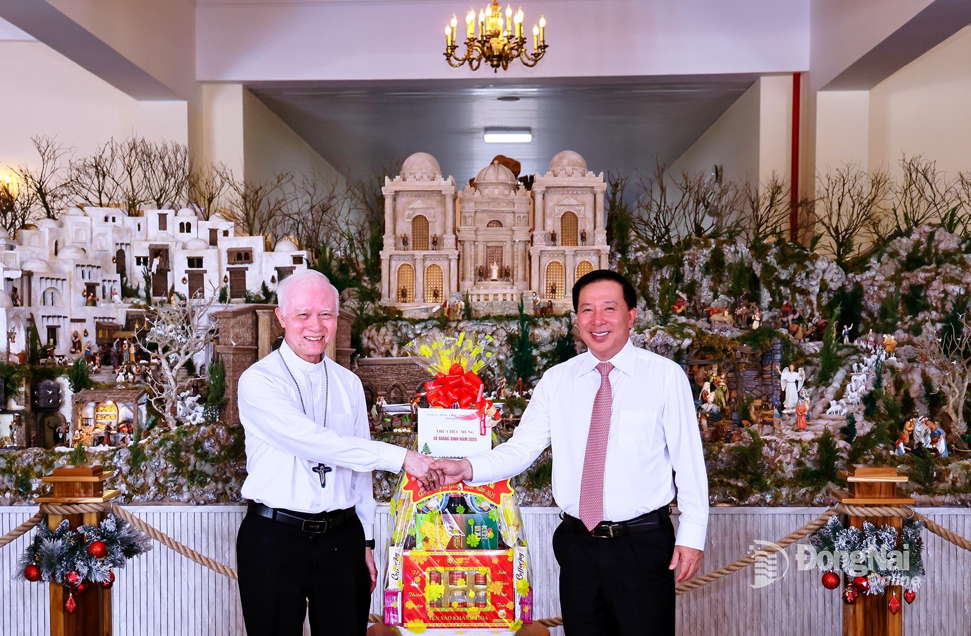 | Phó Bí thư Tỉnh ủy, Chủ tịch UBND tỉnh Đồng Nai Nguyễn Văn Út trao quà của Tỉnh ủy, HĐND, UBND và Ủy ban MTTQ Việt Nam tỉnh cho Giám mục Đinh Đức Đạo. Ảnh: Công Nghĩa |