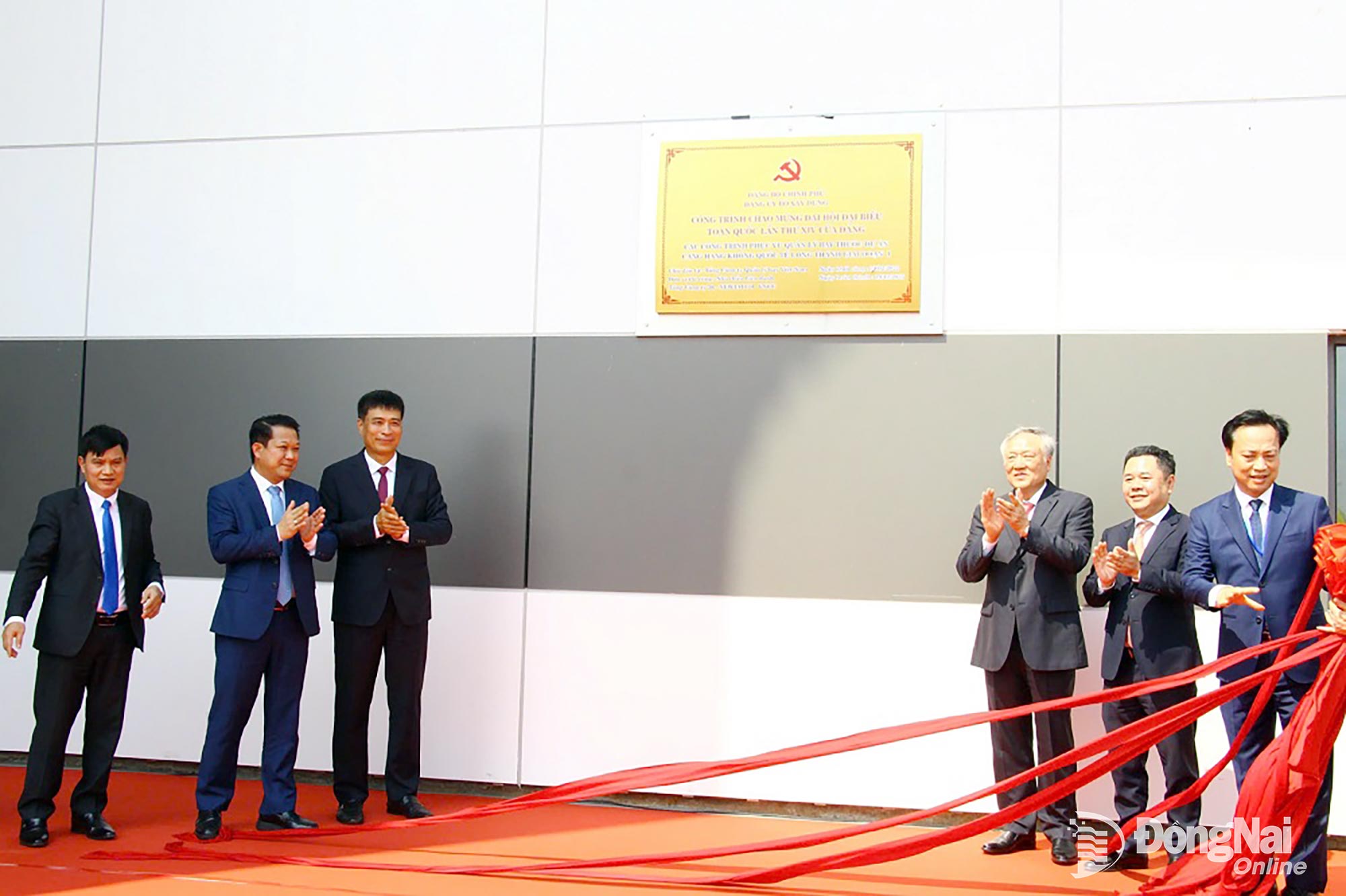 | Ủy viên Bộ Chính trị, Phó Thủ tướng Thường trực Chính phủ Nguyễn Hòa Bình và các đại biểu gắn biển công trình chào mừng Đại hội đại biểu toàn quốc lần thứ XIV của Đảng đối với các công trình phục vụ quản lý bay Sân bay Long Thành. Ảnh: Phạm Tùng |