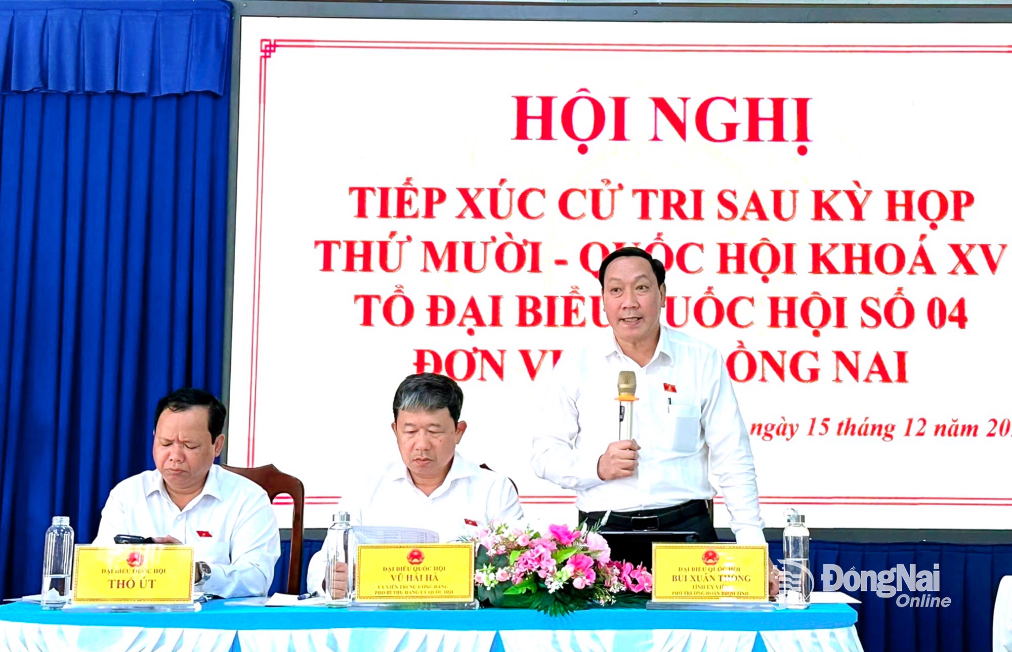 | Đại biểu Bùi Xuân Thống, Tỉnh ủy viên, Phó Trưởng đoàn chuyên trách Đoàn đại biểu Quốc hội tỉnh Đồng Nai trao đổi với cử tri tại hội nghị. Ảnh: Đoàn ĐBQH tỉnh |