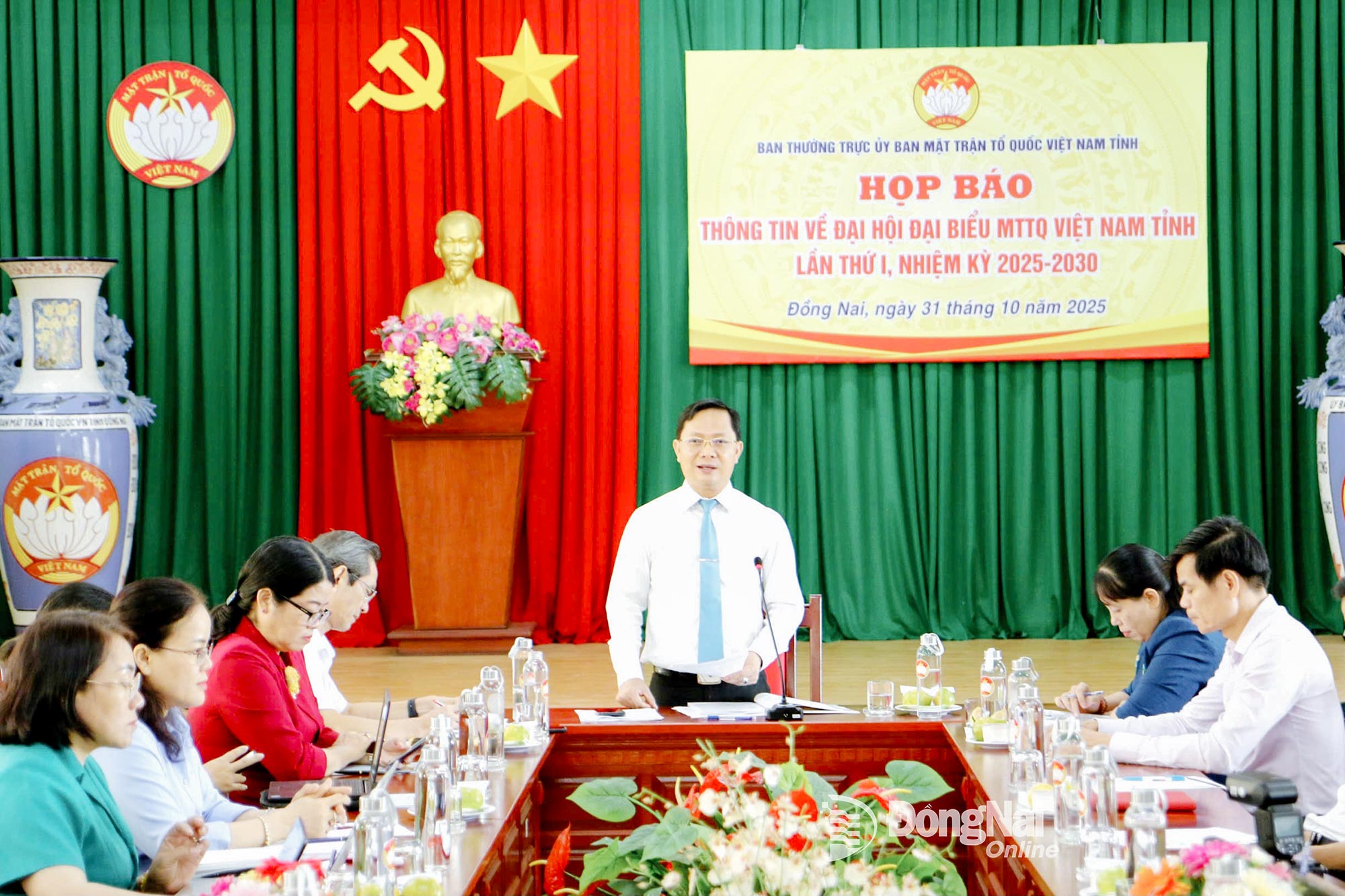 Ngày 31-10, Ban Thường trực Ủy ban MTTQ Việt Nam tỉnh Đồng Nai tổ chức họp báo thông tin về Đại hội đại biểu MTTQ Việt Nam tỉnh lần thứ I, nhiệm kỳ 2025-2030. Ủy viên Ban Thường vụ Tỉnh ủy, Phó Chủ tịch Thường trực Ủy ban MTTQ Việt Nam tỉnh Hà Anh Dũng chủ trì họp báo.