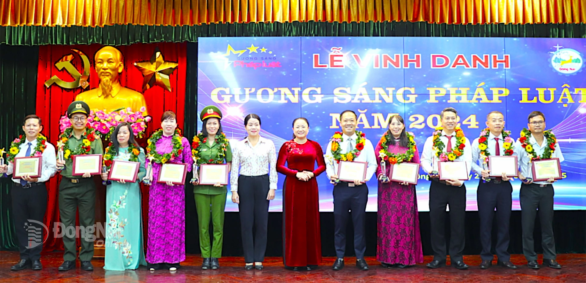 | Ban tổ chức trao cúp và bảng vinh danh cho 10 cá nhân đạt danh hiệu Gương sáng pháp luật Đồng Nai năm 2024. Ảnh: An Nhơn |