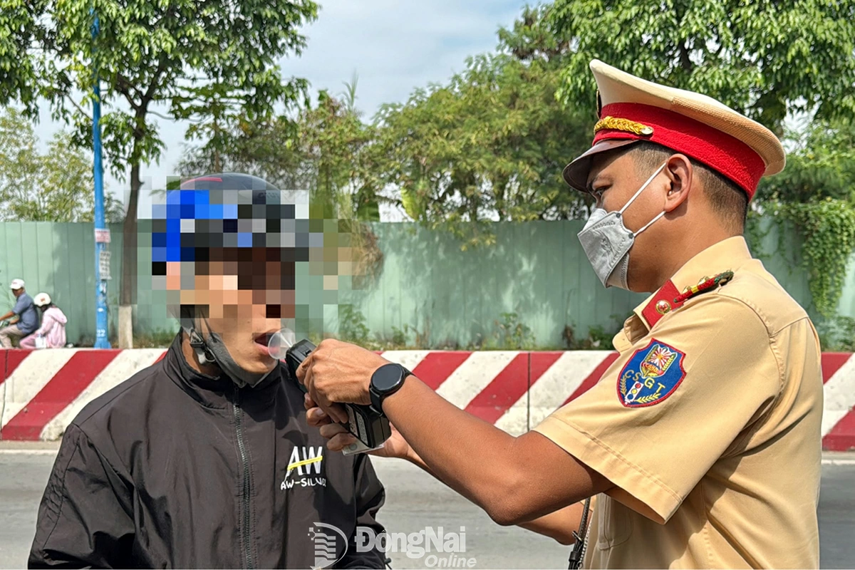 | Lực lượng cảnh sát giao thông kiểm tra nồng độ cồn của người tham gia giao thông tại phường Trấn Biên (tỉnh Đồng Nai). Ảnh: Đăng Tùng |