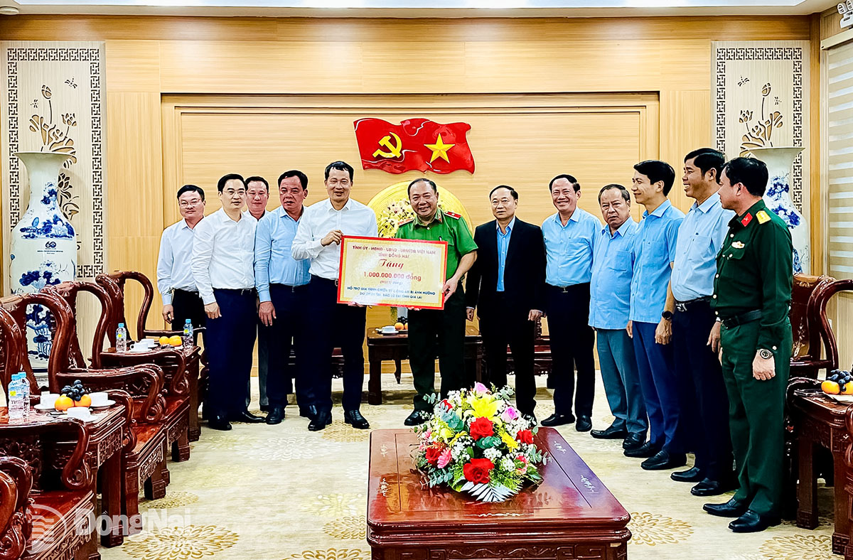 | Đồng chí Vũ Hồng Văn, Bí thư Tỉnh ủy, Trưởng đoàn Đại biểu Quốc hội tỉnh Đồng Nai trao kinh phí hỗ trợ gia đình, chiến sĩ công an bị thiệt hại do thiên tai. Ảnh Hồng Thương |