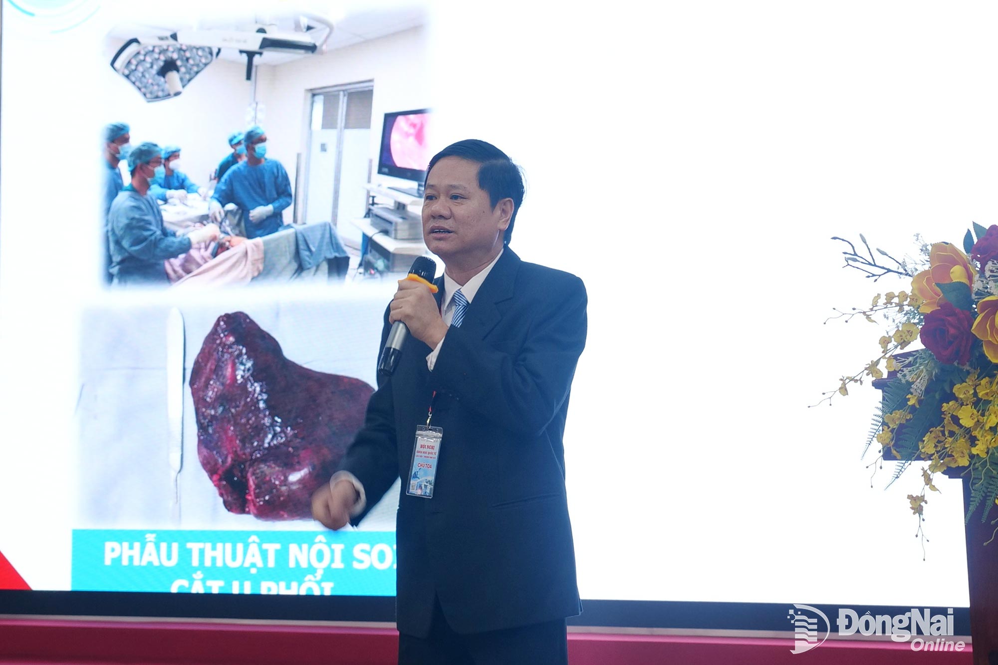 | Giám đốc Bệnh viện Đa khoa Thống Nhất Nguyễn Tường Quang báo cáo đề tài tại hội nghị. Ảnh: Hạnh Dung |