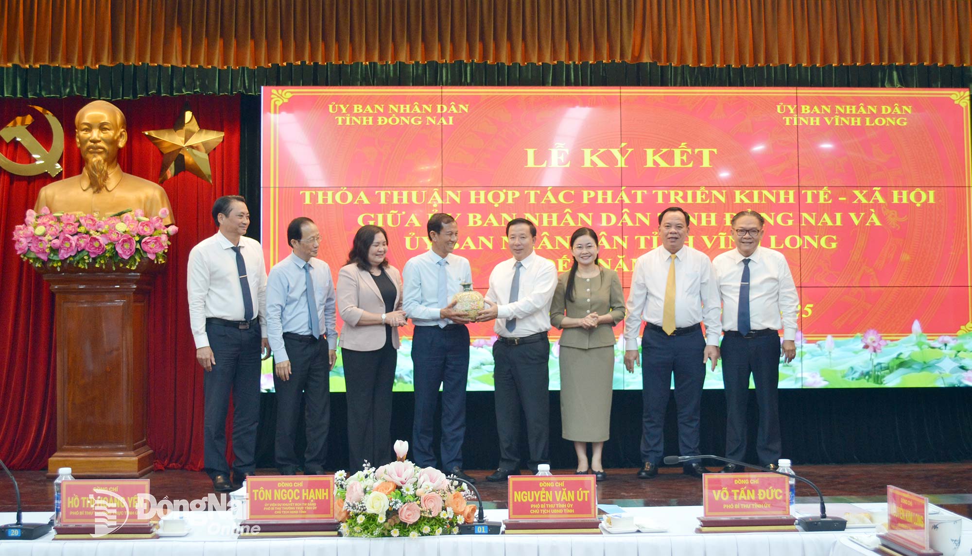| Lãnh đạo tỉnh Đồng Nai và Vĩnh Long tặng quà lưu niệm. Ảnh: Phương Hằng |