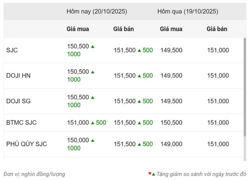 Cụ thể, tại thời điểm 12 giờ ngày 20-10, Công ty Vàng bạc đá quý Sài Gòn (SJC) niêm yết giá vàng miếng SJC mua vào-bán ra ở mức 150,5-151,5 triệu đồng/lượng, tăng lần lượt 1 triệu đồng và 500.000 đồng so kết phiên trước đó. Chênh lệch mua-bán 1 triệu đồng/lượng.