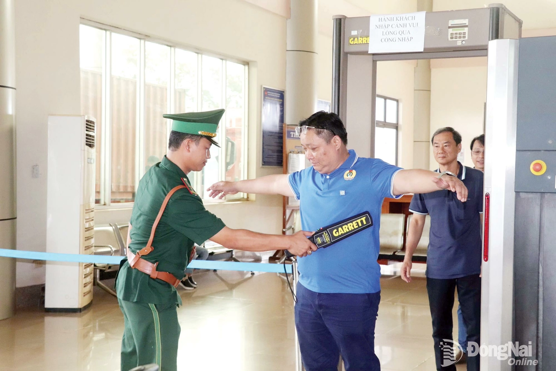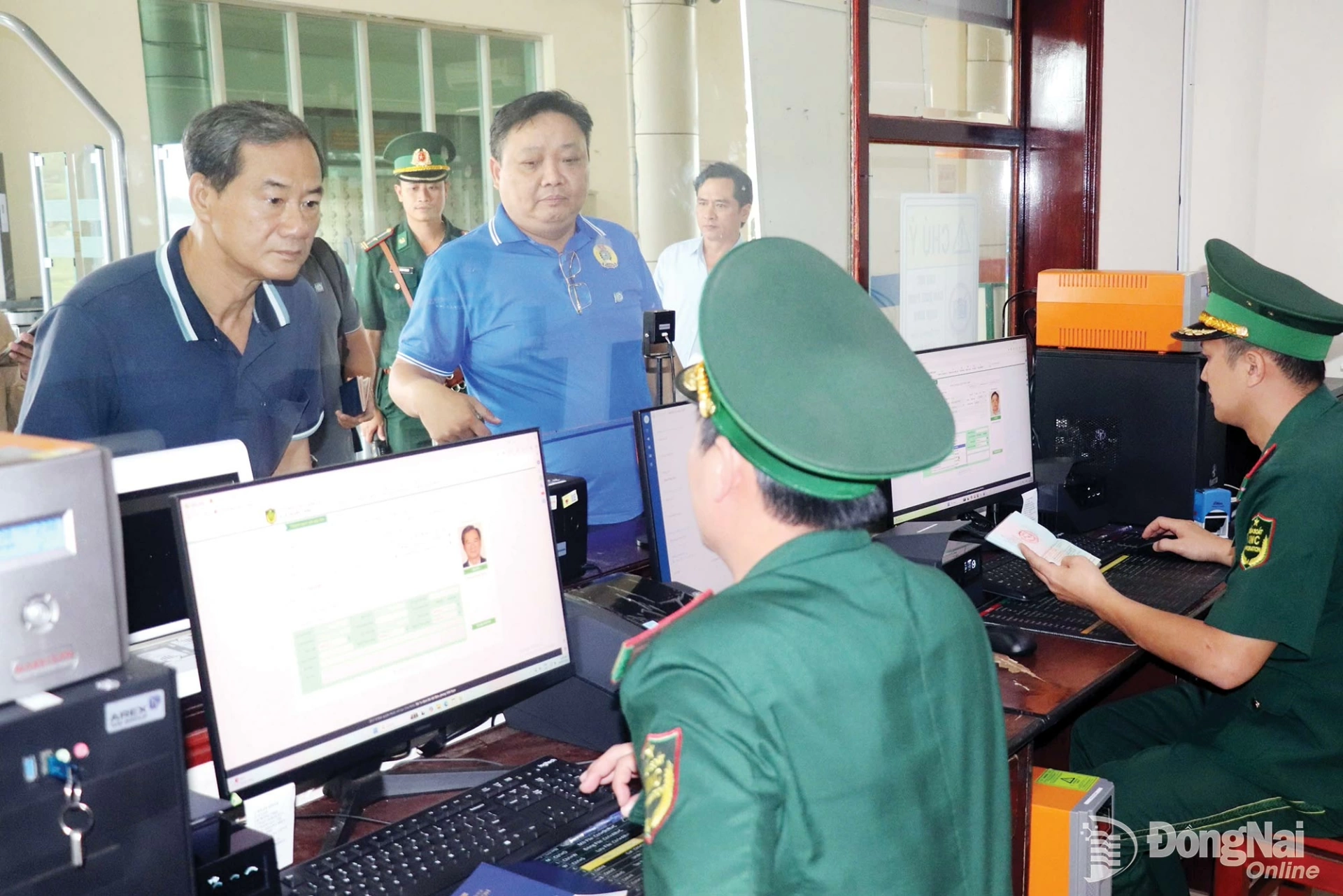 | Nhân viên Đồn Biên phòng Cửa khẩu quốc tế Hoa Lư kiểm tra người dân khi làm thủ tục xuất cảnh. |