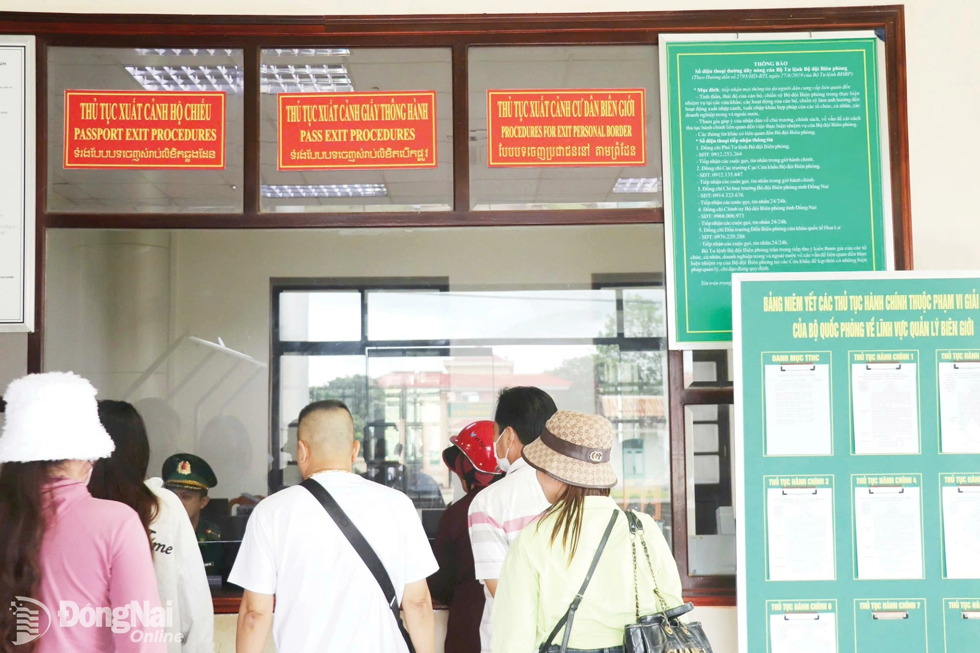 | Cán bộ, chiến sĩ Đồn Biên phòng Cửa khẩu quốc tế Hoa Lư thực hiện thủ tục khai báo xuất cảnh cho người dân. |