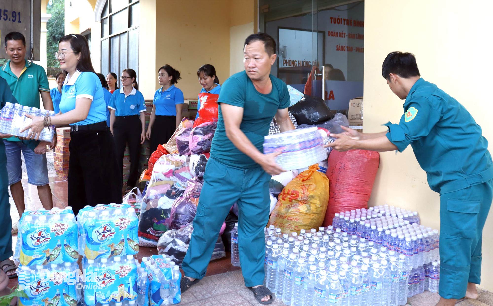 | Cán bộ, hội viên phụ nữ và lực lượng dân quân chuyển hàng hóa lên xe để hành quân đến cứu trợ đồng bào bị bão lũ. Ảnh: Nguyệt Hà |