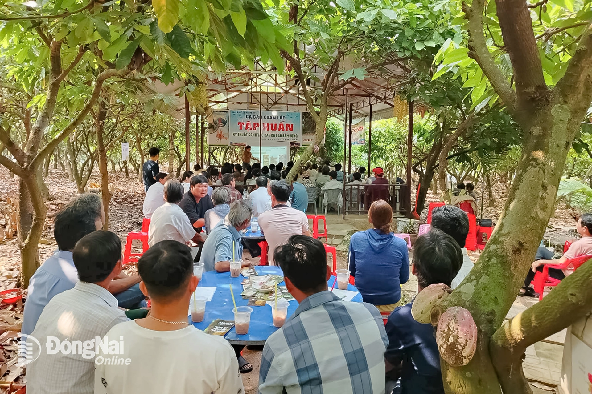 | Nông dân trồng ca cao tham gia lớp tập huấn do ông Trương Văn Mỹ tổ chức. Ảnh: Lê Thủy |
