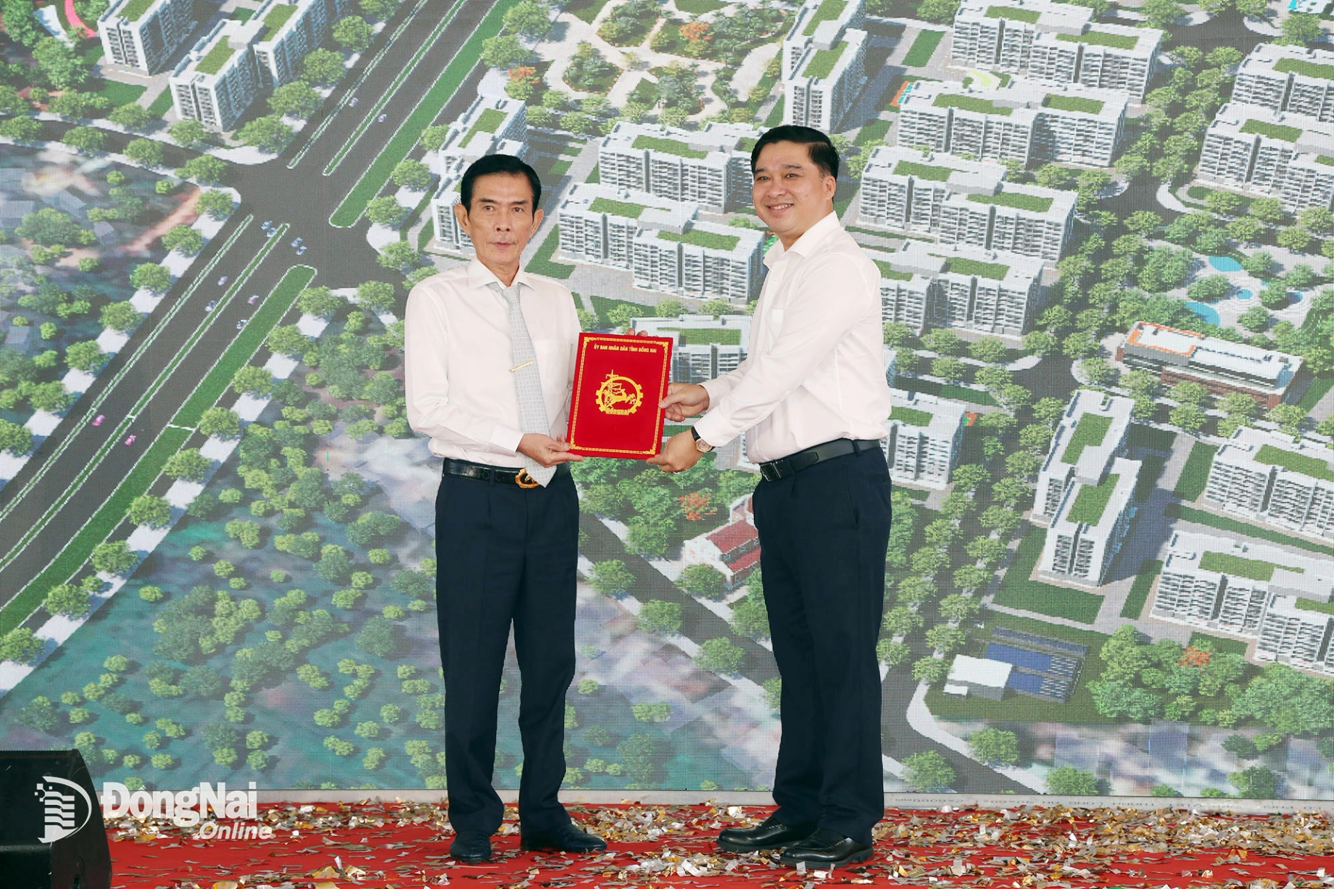 | Đồng chí Hồ Văn Hà, Tỉnh ủy viên, Phó Chủ tịch UBND tỉnh Đồng Nai trao giấy chứng nhận xây dựng nhà ở xã hội cho chủ đầu tư DonaCoop. Ảnh: Nguyễn Hòa |