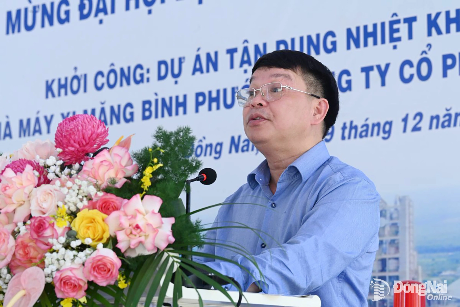 | Ông Nguyễn Quốc Việt, Ủy viên Ban Chấp hành Đảng ủy Chính phủ, Bí thư Đảng ủy, Chủ tịch Hội đồng thành viên Tổng công ty Xi măng Việt Nam phát biểu lại lễ khởi công. Ảnh: Trung Quang |