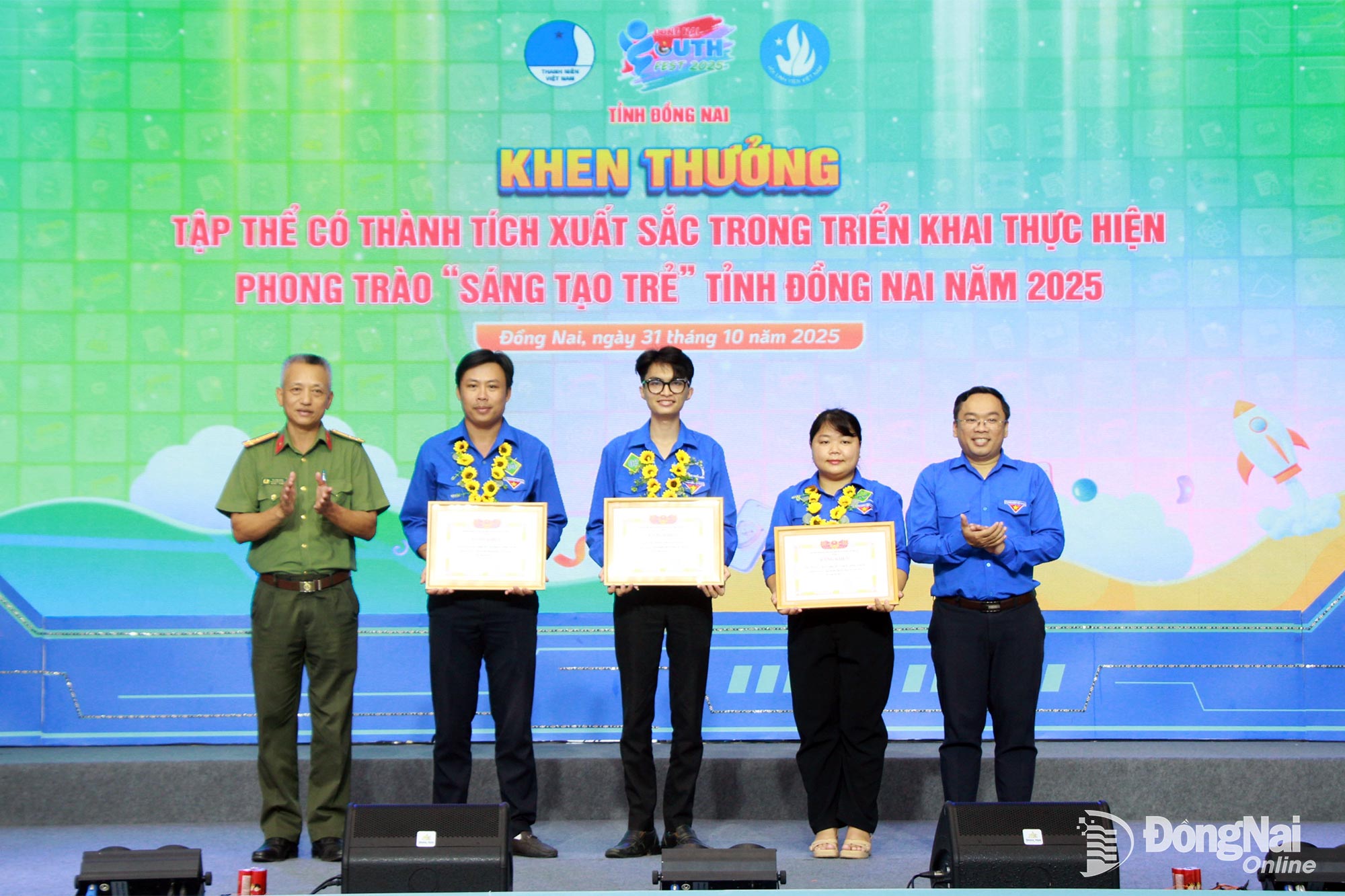 | Tỉnh ủy viên, Phó Chủ tịch Ủy ban MTTQ Việt Nam tỉnh, Bí thư Tỉnh đoàn Nguyễn Minh Kiên và đại diện Công an tỉnh trao bằng khen cho các tập thể đạt thành tích xuất sắc trong Phong trào Sáng tạo trẻ năm 2025. Ảnh: Nga Sơn |