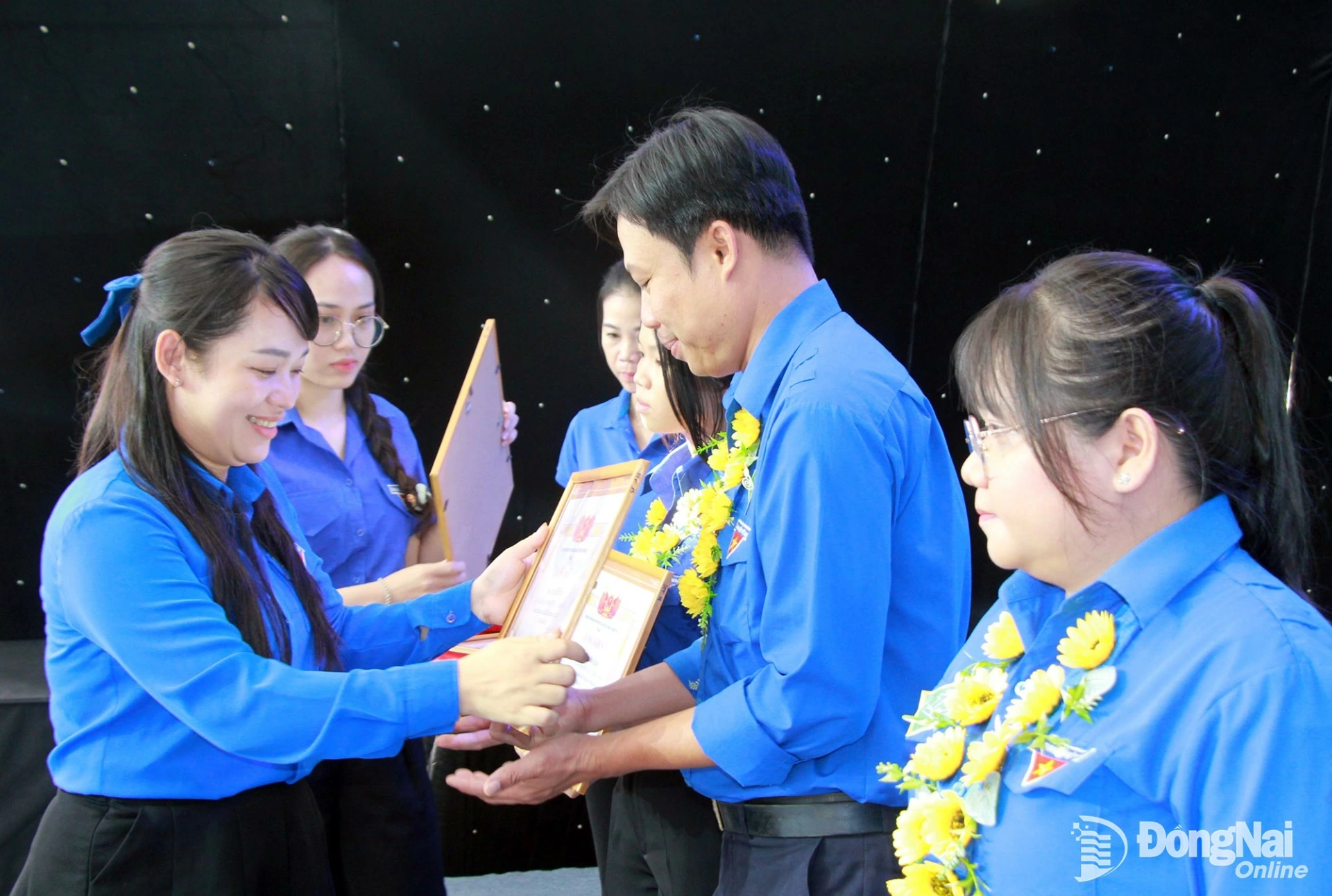 | Phó Bí thư Tỉnh đoàn Nguyễn Trần Phương Hà trao bằng khen cho các cá nhân đạt thành tích xuất sắc trong Phong trào Sáng tạo trẻ năm 2025. Ảnh: Nga Sơn |