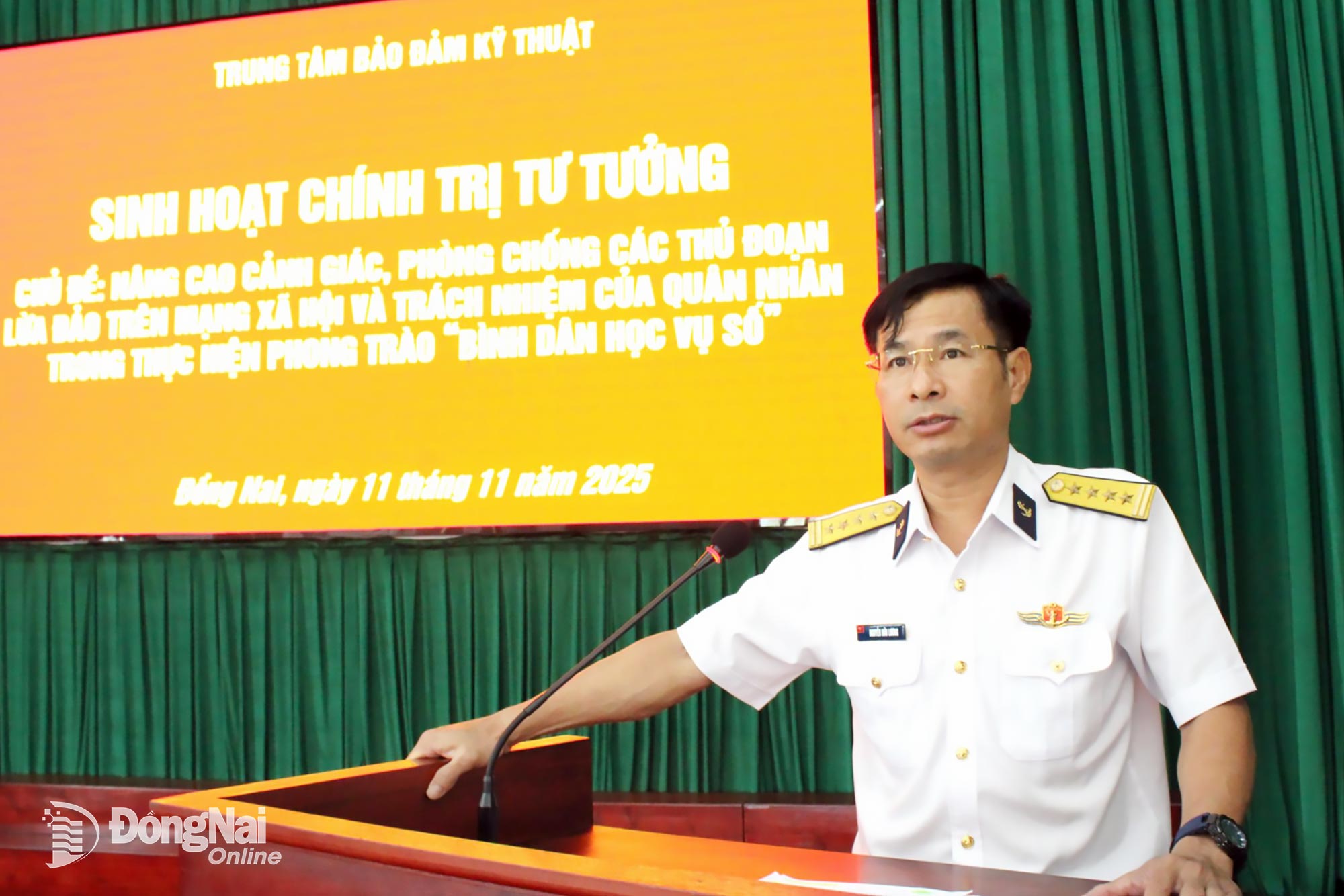 (ĐN) - Chiều 11-11, tại xã Nhơn Trạch, tỉnh Đồng Nai, Đại tá Nguyễn Hữu Lương, Bí thư Đảng ủy, Chính ủy Trung tâm Bảo đảm kỹ thuật Vùng 2 Hải quân (Trung tâm) chủ trì hội nghị sinh hoạt chính trị tư tưởng với chủ đề Nâng cao cảnh giác, phòng chống các thủ đoạn lừa đảo trên mạng xã hội và trách nhiệm của quân nhân trong thực hiện phong trào Bình dân học vụ số.