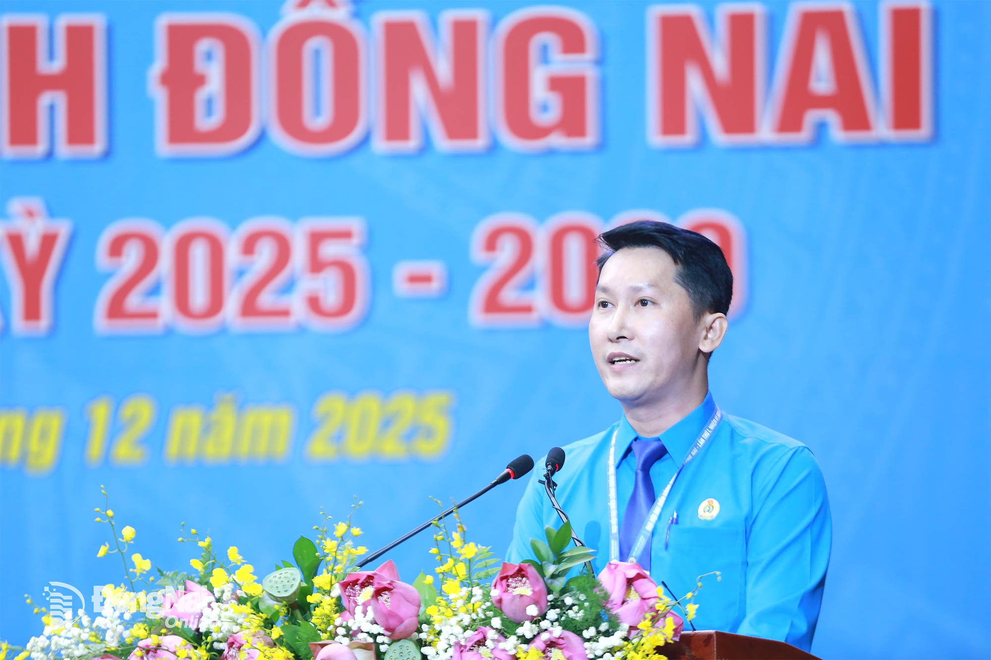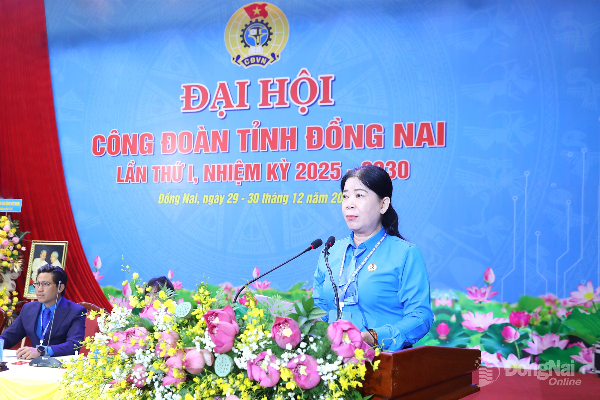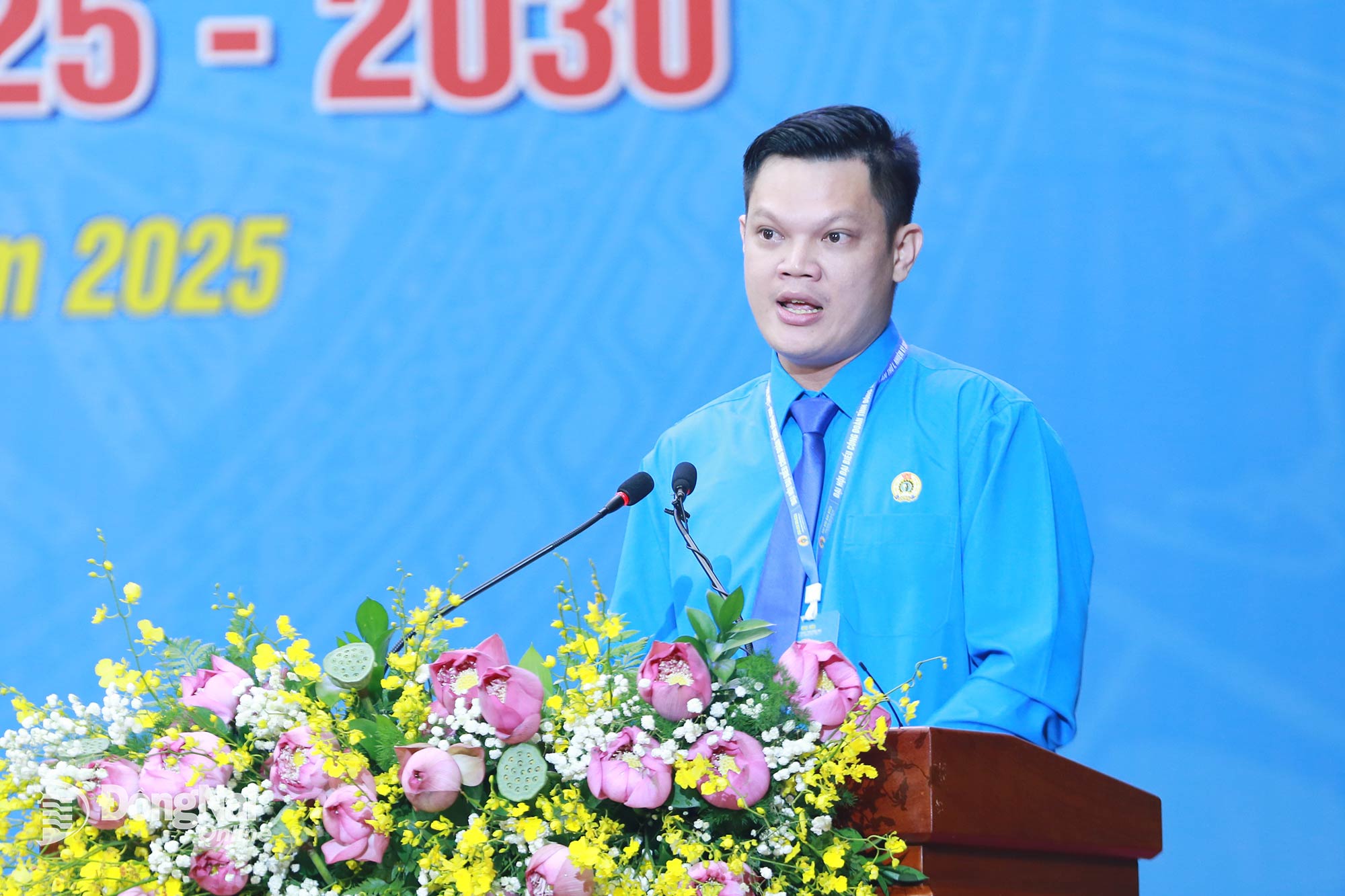 | Chủ tịch Công đoàn phường Trấn Biên Trần Phạm Quốc Dũng trình bày tham luận tại đại hội. Ảnh: Huy Anh |