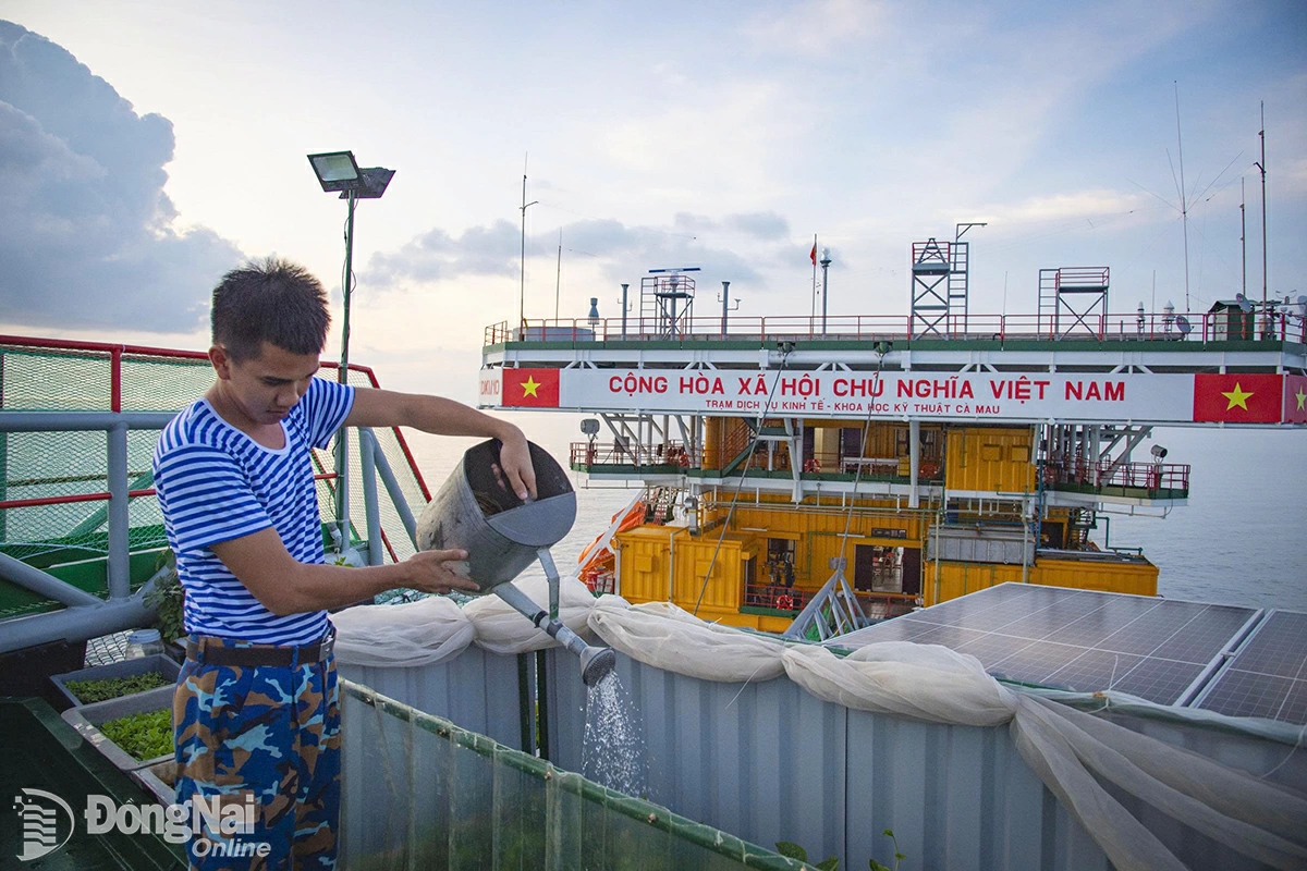 | Thượng sĩ Nguyễn Tấn Duy tưới rau sau giờ huấn luyện, trên nhà giàn DK1/10. Ảnh: Văn Đường |