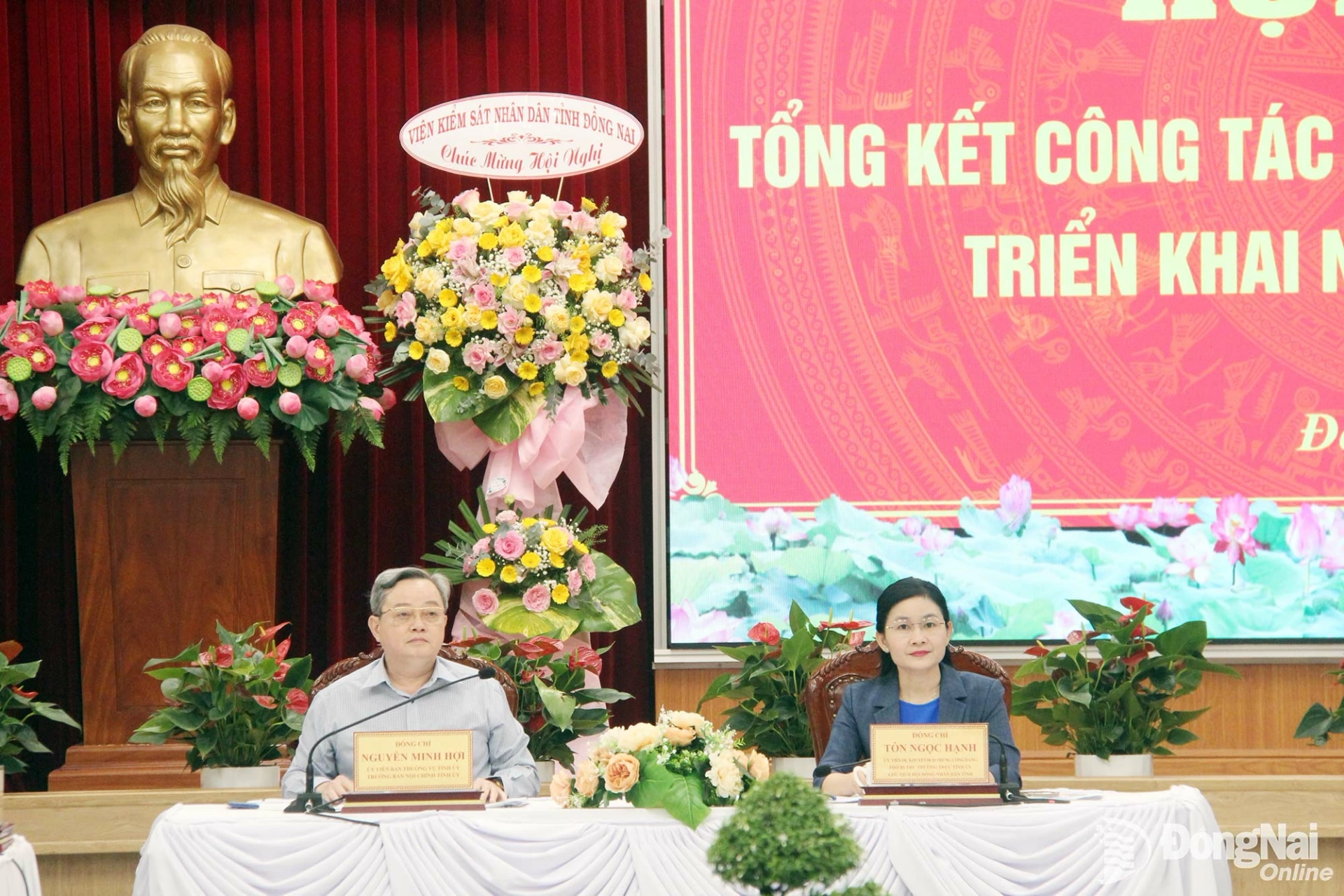 Các đồng chí: Tôn Ngọc Hạnh, Ủy viên dự khuyết Trung ương Đảng, Phó Bí thư Thường trực Tỉnh ủy, Chủ tịch HĐND tỉnh Đồng Nai; Nguyễn Minh Hợi, Ủy viên Ban Thường vụ Tỉnh ủy, Trưởng ban Nội chính Tỉnh ủy Đồng Nai chủ trì hội nghị. Ảnh: Trần Danh