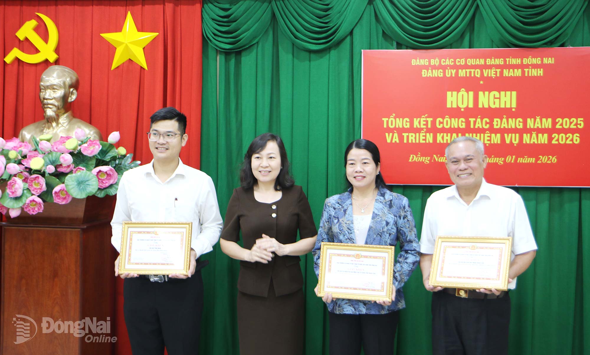 | Đồng chí Huỳnh Thị Hằng, Phó Bí thư Tỉnh ủy, Bí thư Đảng ủy MTTQ Việt Nam tỉnh, Chủ tịch Ủy ban MTTQ Việt Nam tỉnh Đồng Nai trao giấy khen cho các tổ chức Đảng hoàn thành xuất sắc nhiệm vụ năm 2025. Ảnh: Văn Truyên |