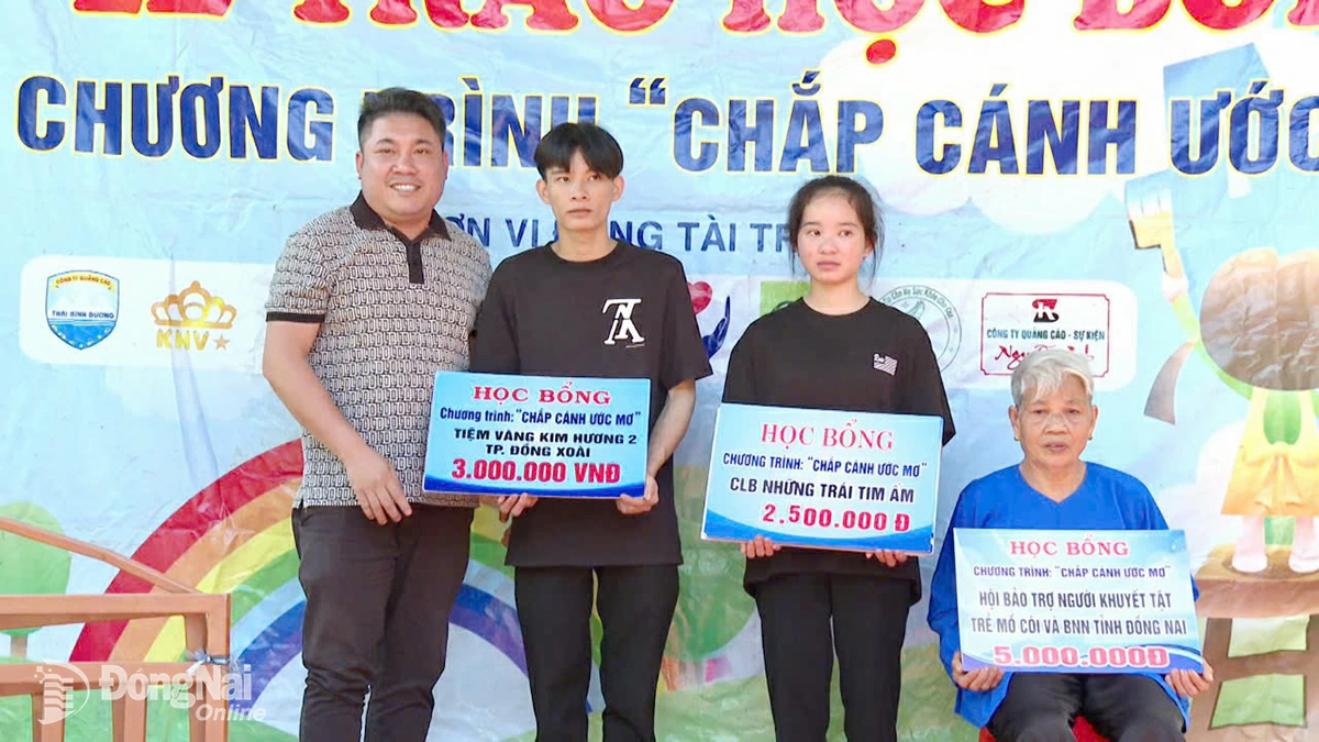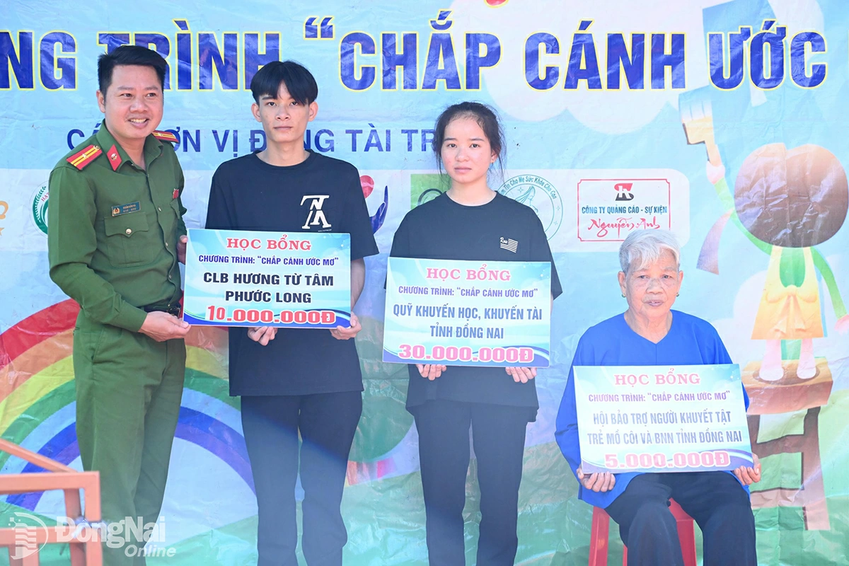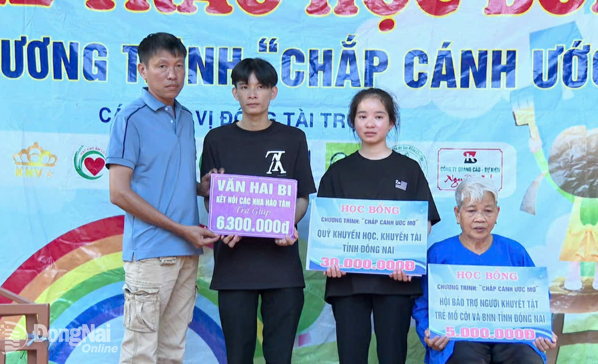 | Hội Khuyến học tỉnh Đồng Nai trao học bổng khuyến học trị giá 30 triệu đồng cho Nam. Ảnh: Phú Qúy |