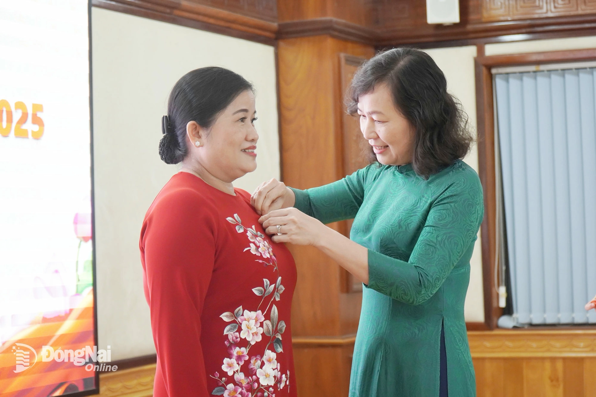 | Phó Bí thư Tỉnh ủy, Chủ tịch Ủy ban MTTQ Việt Nam tỉnh Đồng Nai Huỳnh Thị Hằng trao huy hiệu 60 năm tuổi Đảng cho 2 đảng viên. Ảnh: Vũ Nguyện |