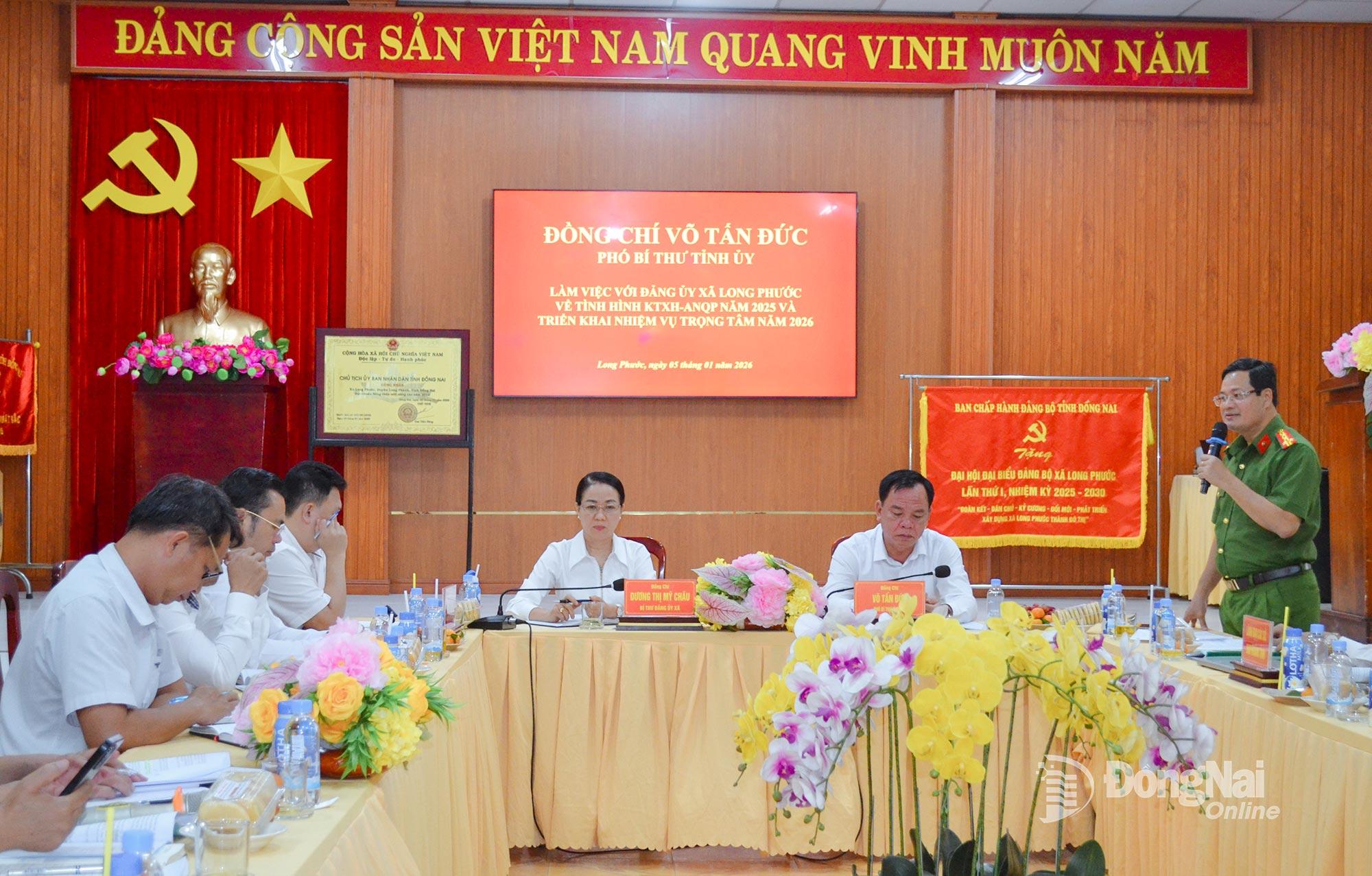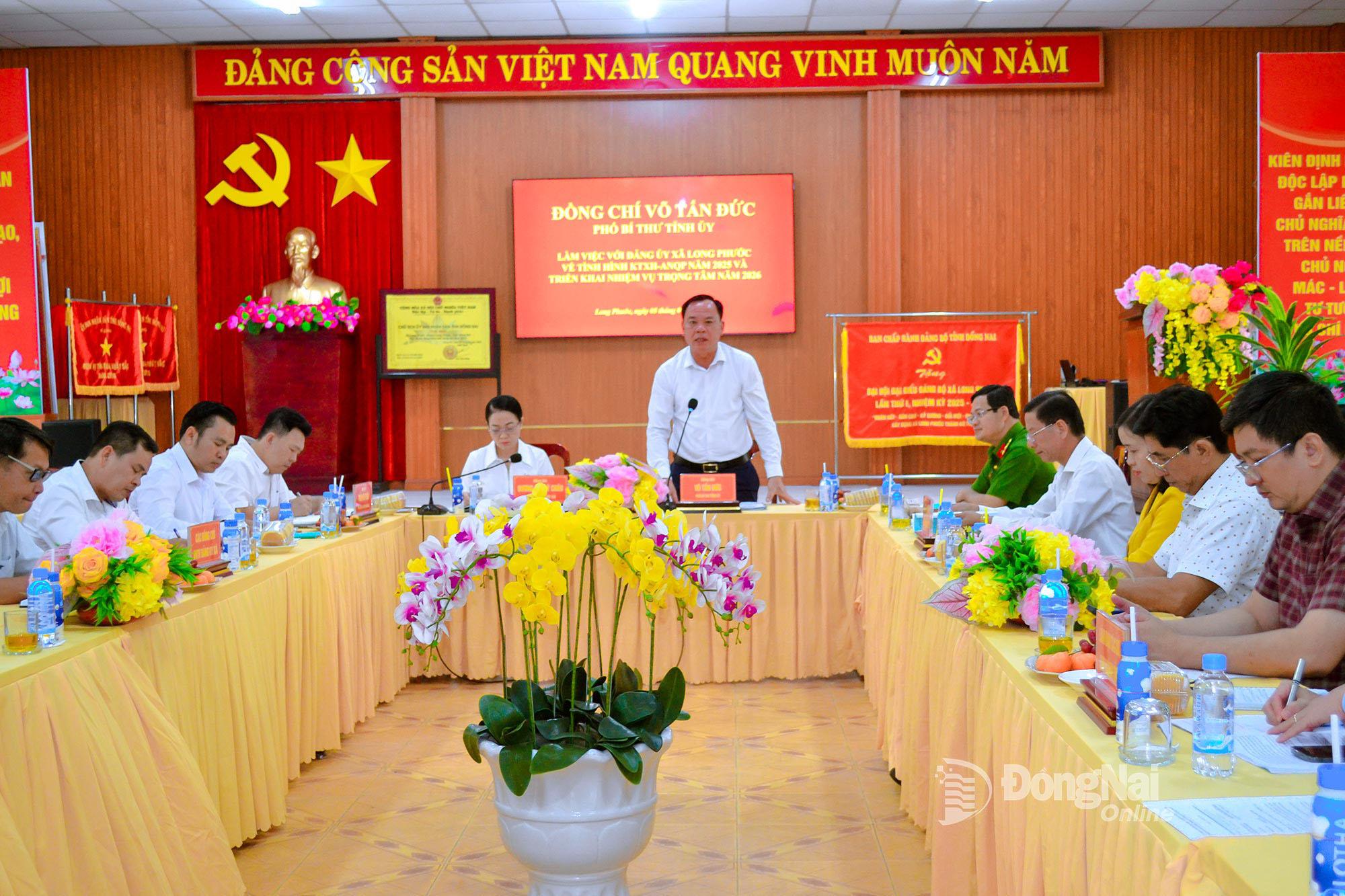 Phát biểu tại buổi làm việc, Phó Bí thư Tỉnh ủy Võ Tấn Đức đề nghị Đảng ủy xã Long Phước tiếp thu đầy đủ các ý kiến chỉ đạo, góp ý của các đồng chí tham dự buổi làm việc, sớm hoàn chỉnh chương trình hành động thực hiện nhiệm vụ năm 2026. Phát huy tinh thần đoàn kết, đổi mới, sáng tạo; quyết tâm khắc phục hạn chế, nâng cao hiệu quả hoạt động của hệ thống chính trị, góp phần thực hiện thắng lợi Nghị quyết Đại hội Đảng bộ tỉnh và Đảng bộ xã nhiệm kỳ 2025-2030.