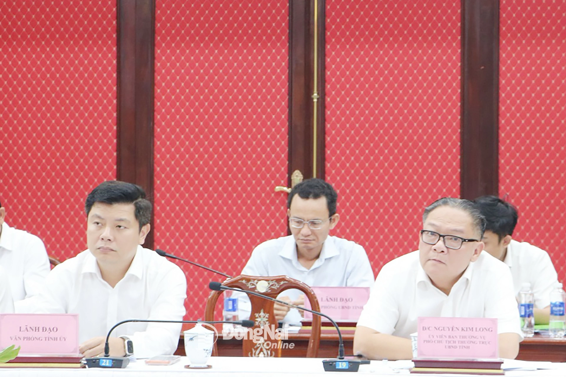 | Ủy viên Ban Thường vụ Tỉnh ủy, Phó Chủ tịch Thường trực UBND tỉnh Đồng Nai Nguyễn Kim Long (phải) và các đại biểu tham dự hội nghị tại điểm cầu chính UBND tỉnh. Ảnh: Phạm Tùng |