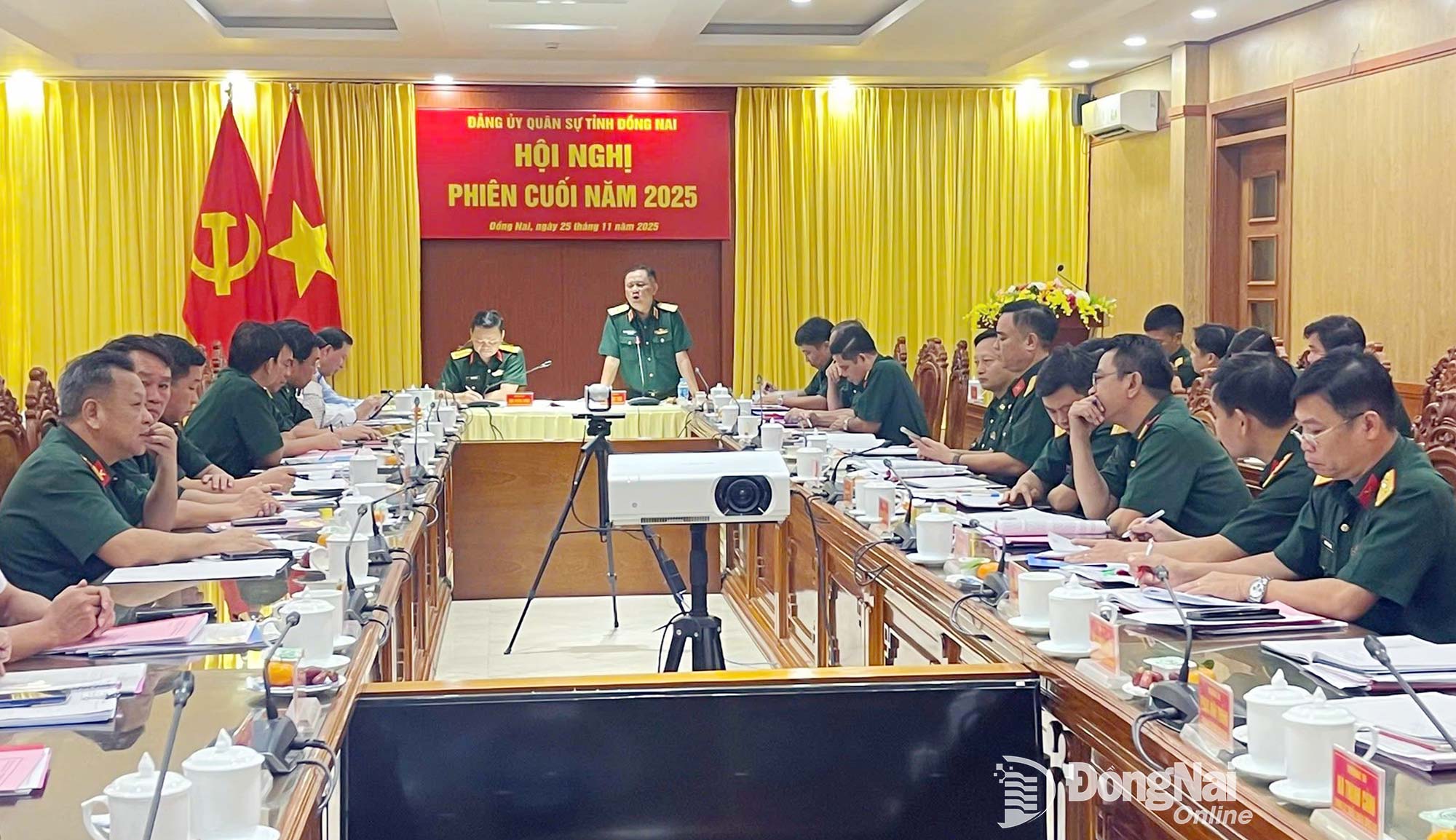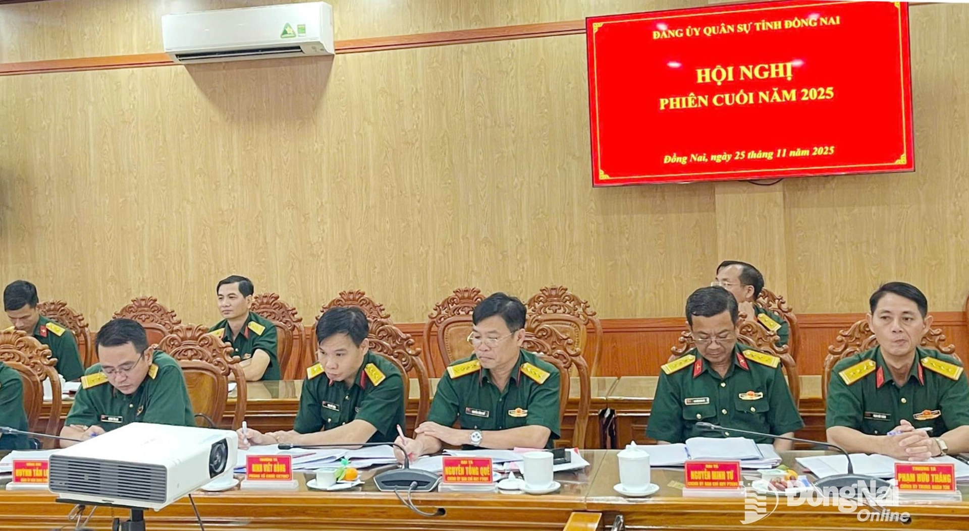 (ĐN) - Chiều 25-11, Đảng ủy Quân sự tỉnh tổ chức hội nghị phiên cuối năm và ra nghị quyết lãnh đạo năm 2026. Thiếu tướng Trần Chí Tâm, Ủy viên Thường vụ Đảng ủy, Phó Chính ủy Quân khu 7; Phó Bí thư Tỉnh ủy, Chủ tịch UBND tỉnh Đồng Nai Nguyễn Văn Út và các đại biểu dự hội nghị.