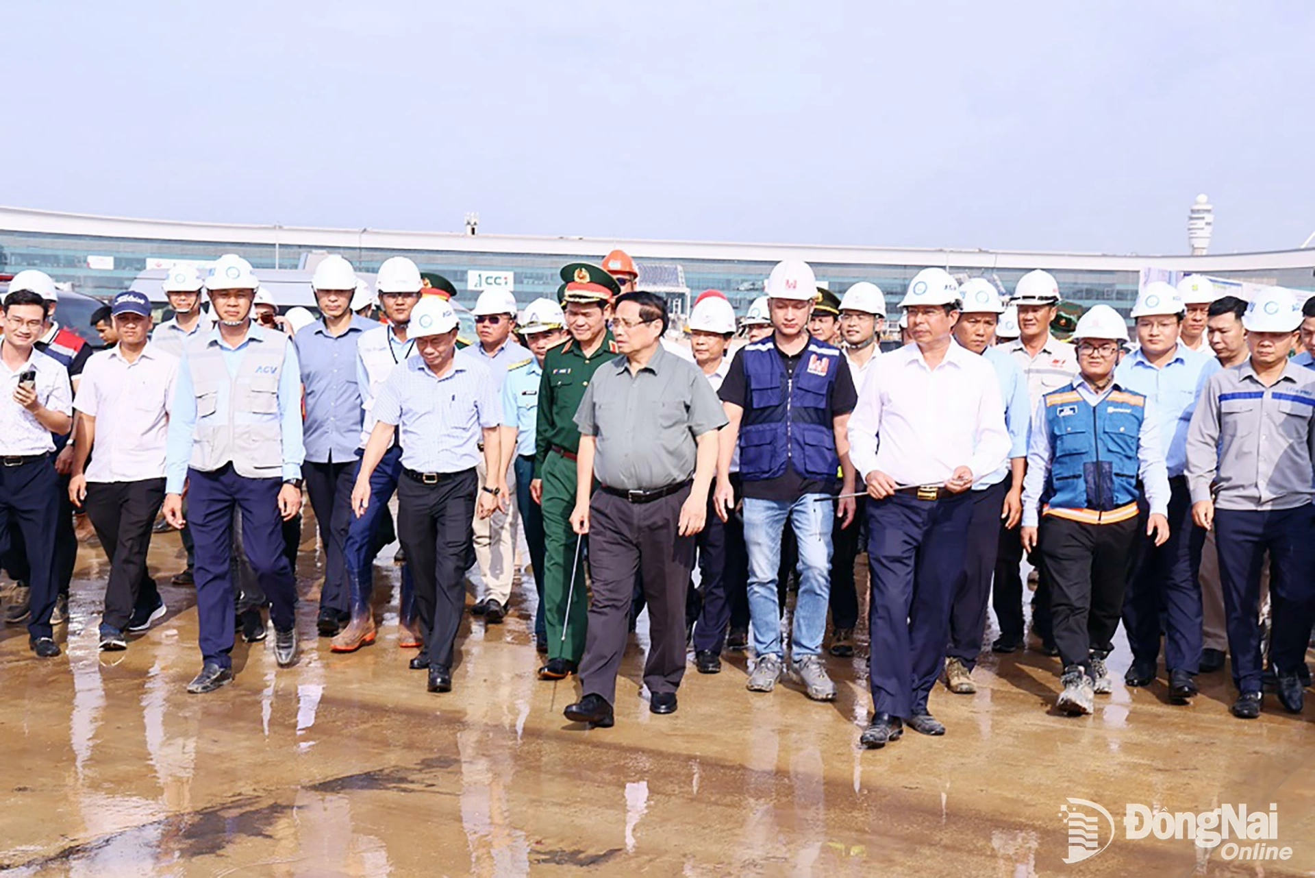 Thủ tướng Chính phủ Phạm Minh Chính kiểm tra khu vực sân đỗ tàu bay Sân bay Long Thành. Ảnh: Công Nghĩa