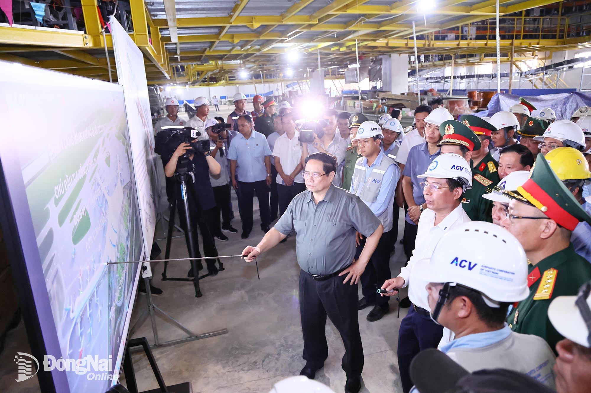 Thủ tướng Chính phủ Phạm Minh Chính kiểm tra tiến độ thi công công trình nhà ga hành khách Sân bay Long Thành. Ảnh: Công Nghĩa