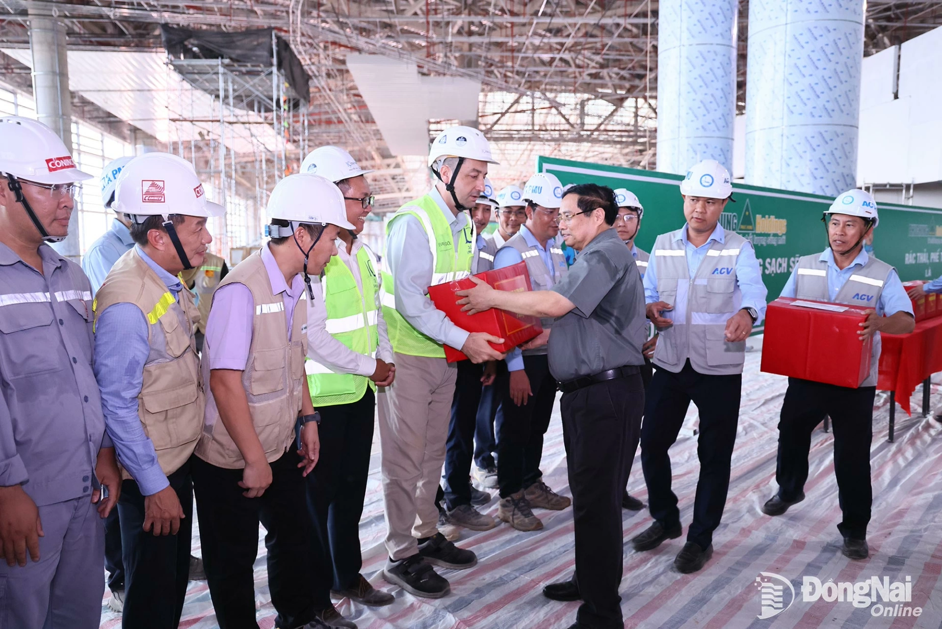 Thủ tướng Chính phủ Phạm Minh Chính tặng quà động viên các lực lượng thi công dự án. Ảnh: Công Nghĩa