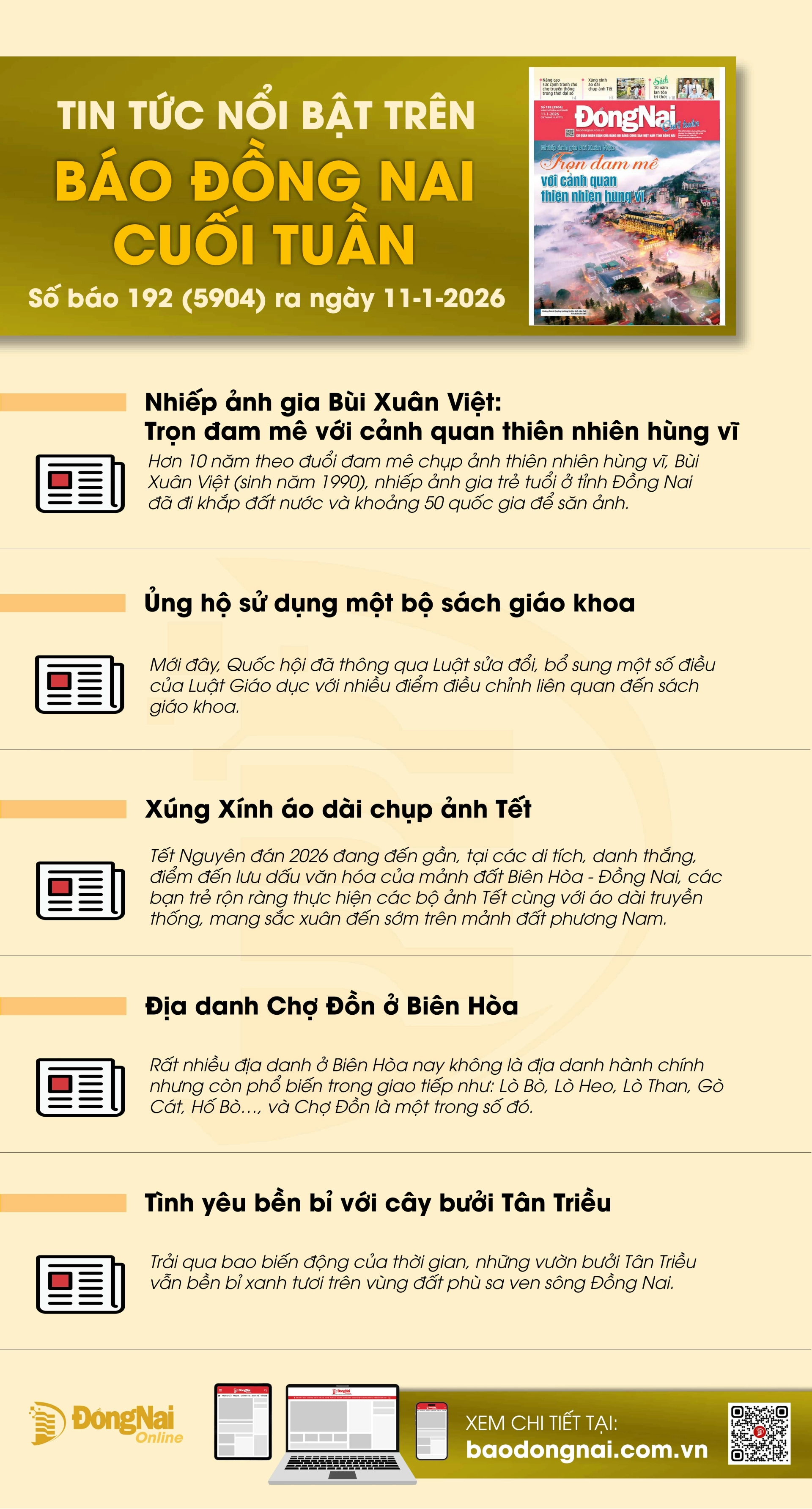 Chủ nhật, 11/01/2026 | 06:59 A- A A+ | Tin tức nổi bật trên Báo Đồng Nai cuối tuần ngày 11-1-2026 baodongnai.com.vn Bình luận Email* Ý kiến của bạn* Nhập lại Gửi Các tin khác 🔴[Livestream] - Đêm nhạc 'Nhạc sĩ Ánh Dương - Chào em cô gái Lam Hồng' Đoàn công tác vùng biển Tây Nam thăm, chúc Tết tại đảo Hòn Khoai Hoàng Nguyên Thanh, Hoàng Thị Ngọc Hoa vô địch 21km Giải Marathon Thành phố Hồ Chí Minh lần thứ 13 Kiểm tra sẵn sàng chiến đấu bảo vệ cao điểm Đại hội lần thứ XIV của Đảng Biểu diễn trống kèn chào mừng Đại hội Đảng toàn quốc lần thứ XIV Bảo Việt Nhân thọ Đồng Nai phấn đấu đạt 68 tỷ đồng doanh thu khai thác mới