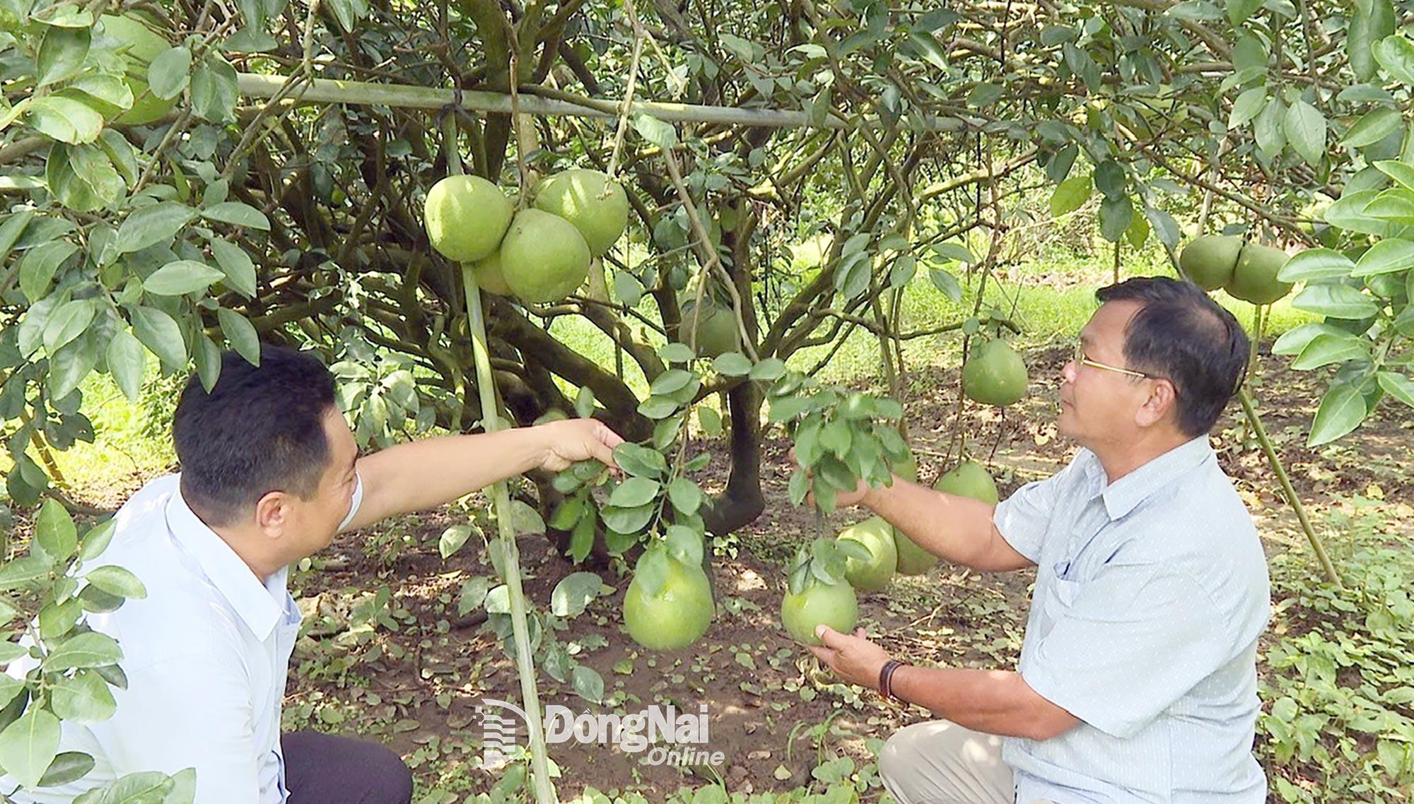 | Những chùm bưởi đường lá cam trĩu quả, minh chứng cho sức sống bền bỉ của cây bưởi Tân Triều trên vùng đất phù sa ven sông Đồng Nai. Trong ảnh: Ông Trần Văn Hùng (phải) giới thiệu với khách về cây bưởi Tân Triều. |