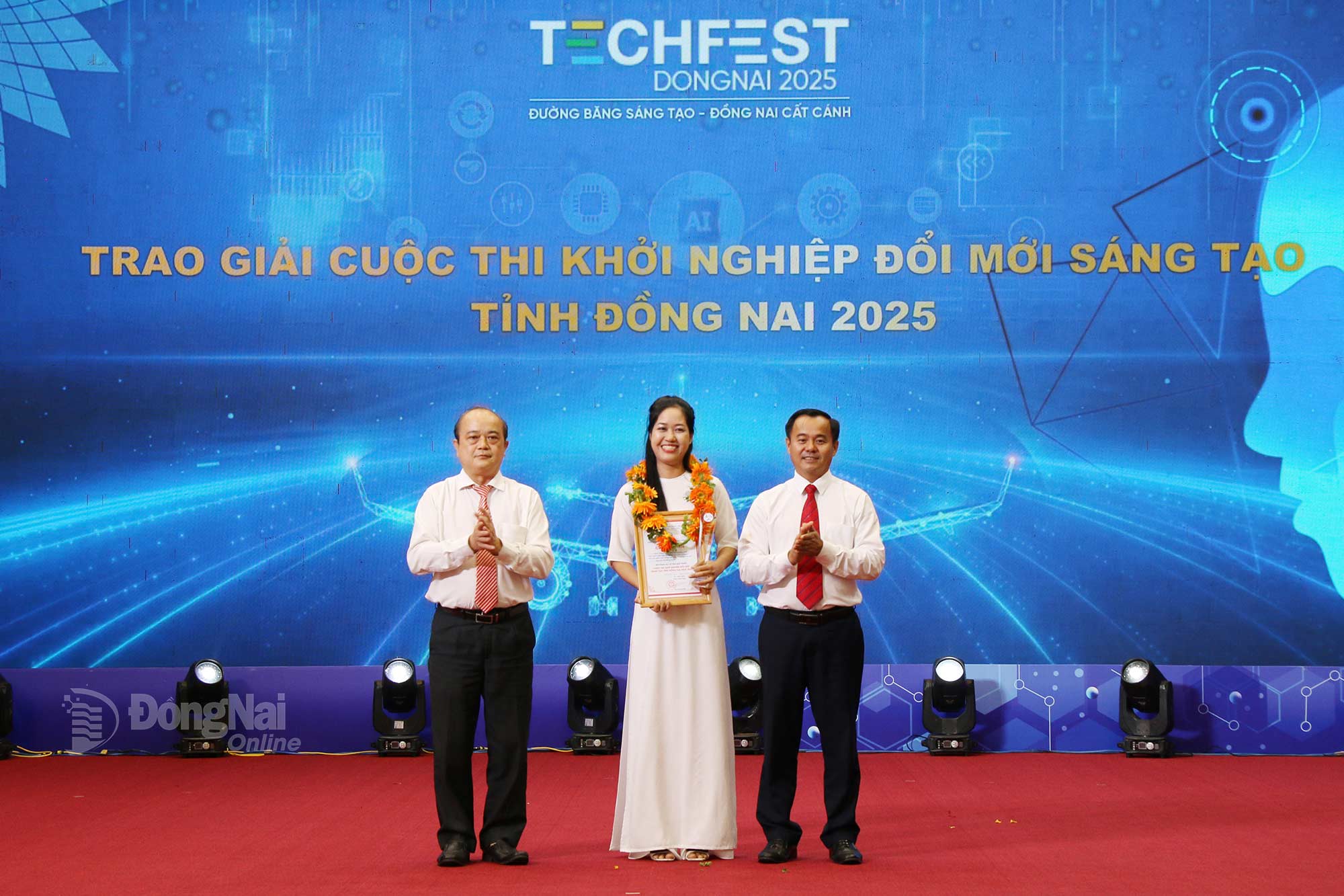 | Lãnh đạo Sở Khoa học và Công nghệ trao giải Nhất Cuộc thi Khởi nghiệp đổi mới sáng tạo tỉnh Đồng Nai cho tác giả Nguyễn Thị Hồng Tuyến. Ảnh: Hải Quân |