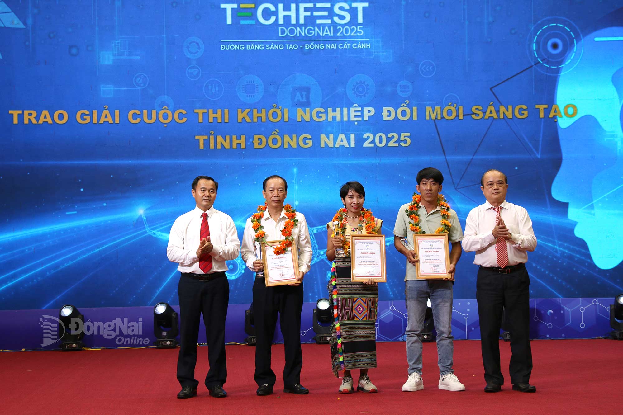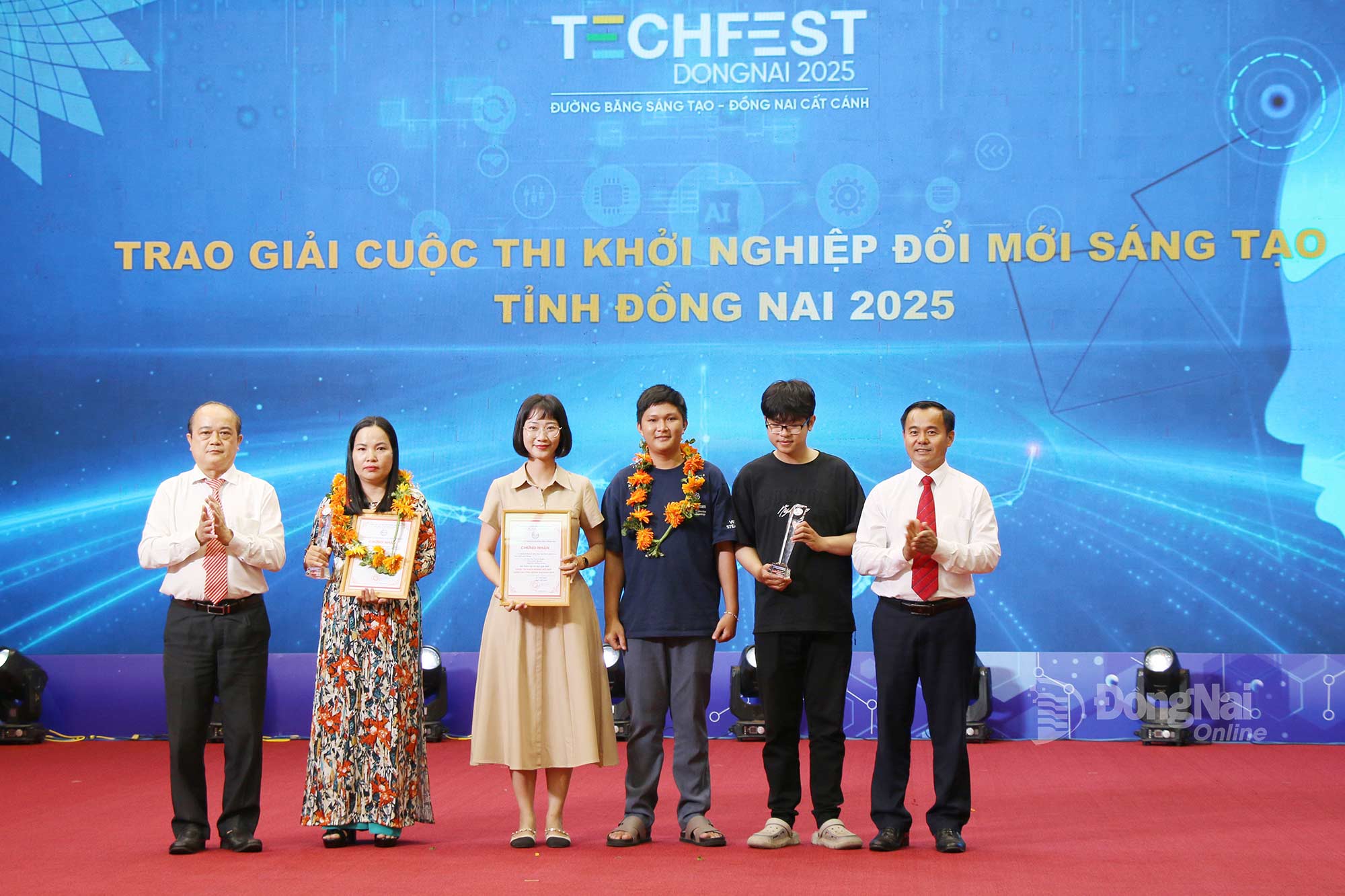 | Lãnh đạo Sở Khoa học và Công nghệ trao giải Nhì Cuộc thi Khởi nghiệp đổi mới sáng tạo tỉnh Đồng Nai cho các nhóm tác giả. Ảnh: Hải Quân |
