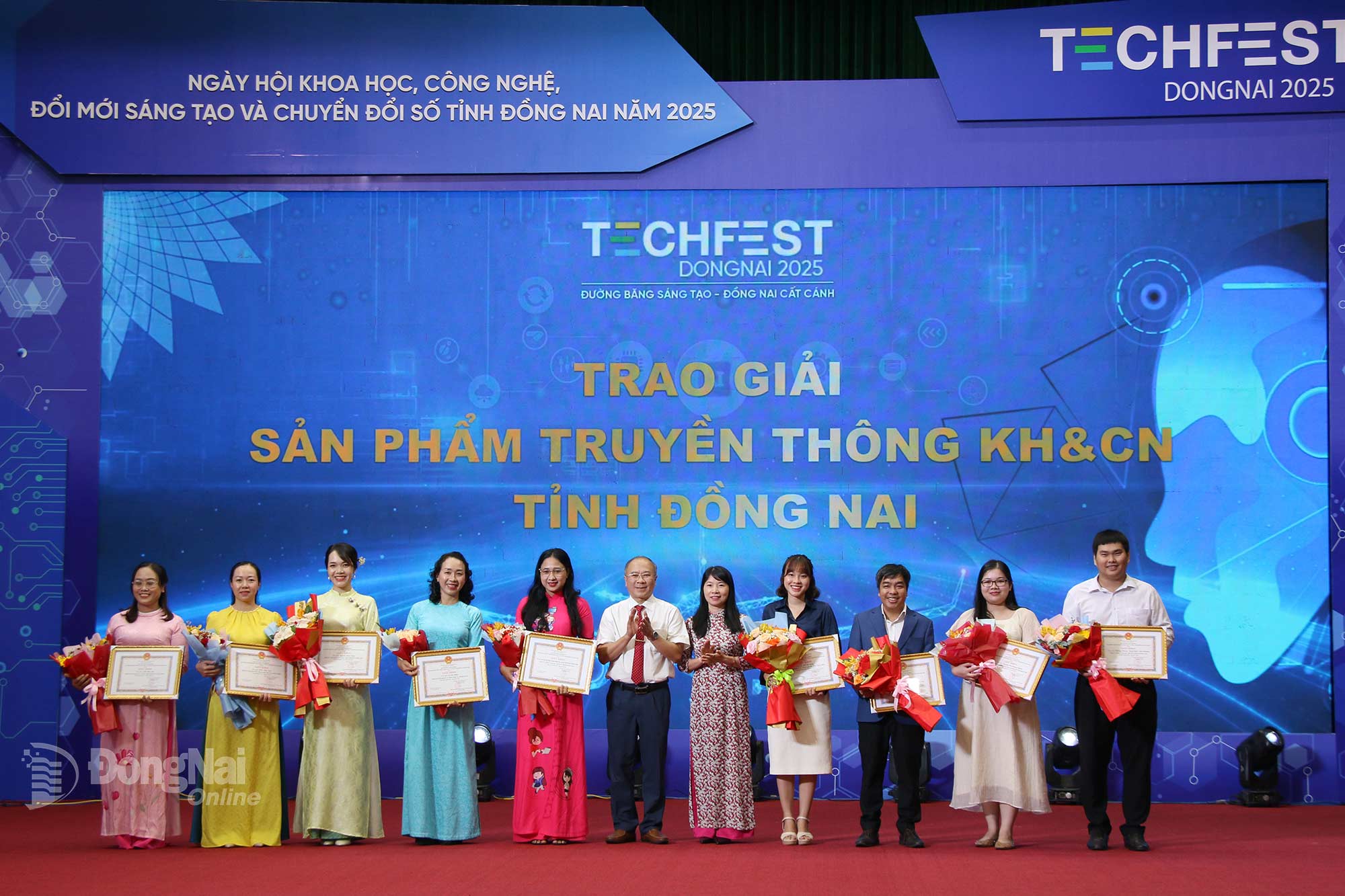| Ủy viên Ban Thường vụ Tỉnh ủy, Phó Chủ tịch UBND tỉnh Đồng Nai Lê Trường Sơn và Tỉnh ủy viên, Giám đốc Sở Khoa học và Công nghệ tỉnh Đồng Nai Phạm Văn Trinh trao giải cho các nhóm tác giả đoạt giải Nhất Giải thưởng Sản phẩm truyền thông khoa học và công nghệ Đồng Nai năm 2025. Ảnh: Hải Quân |