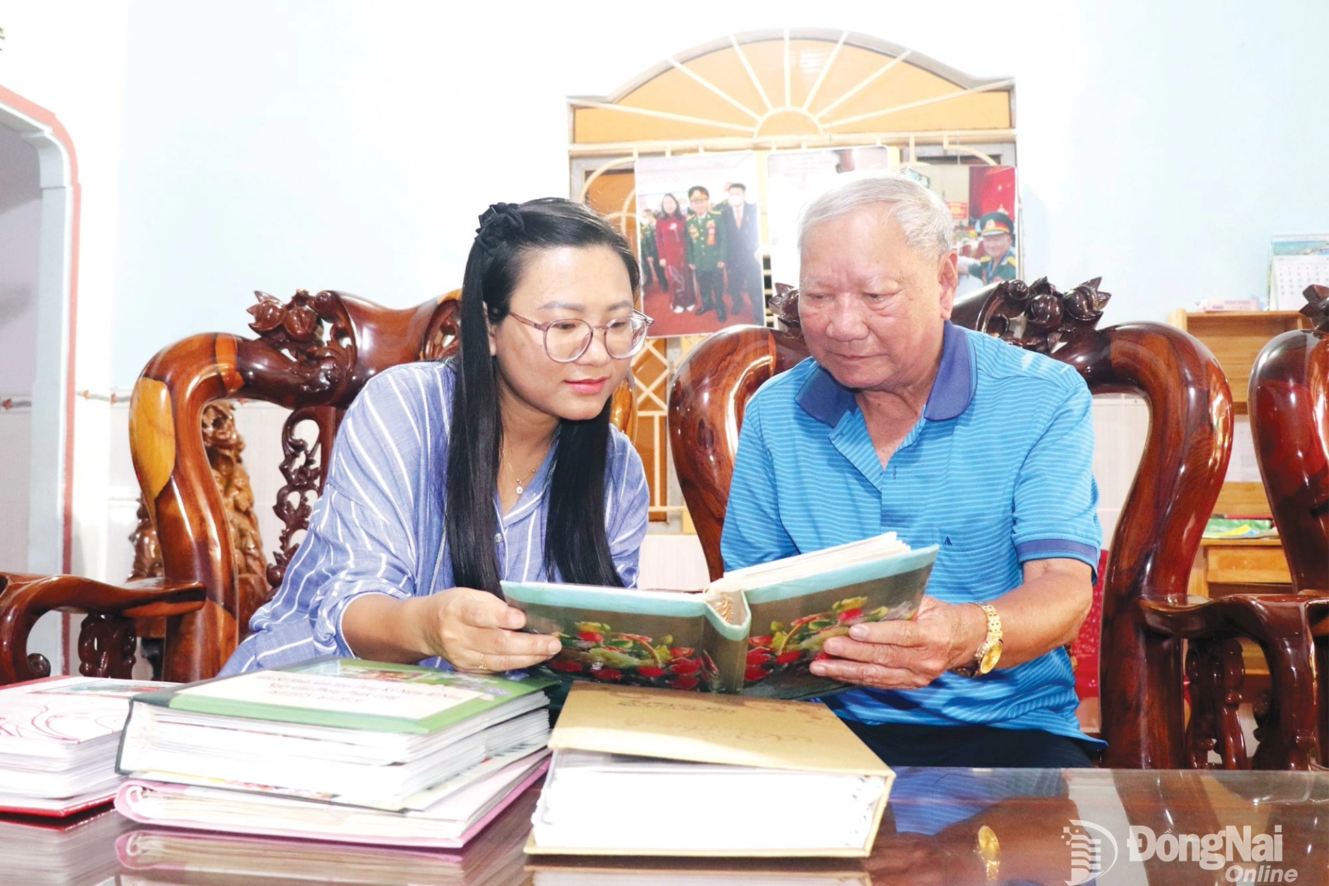 | Ông Lê Lý Trịnh và phóng viên xem lại album ảnh Lễ kỷ niệm lần thứ 10 Ngày Phước Long giải phóng (6-1-1975 - 6-1-1985). Ảnh: Anh Ngọc |