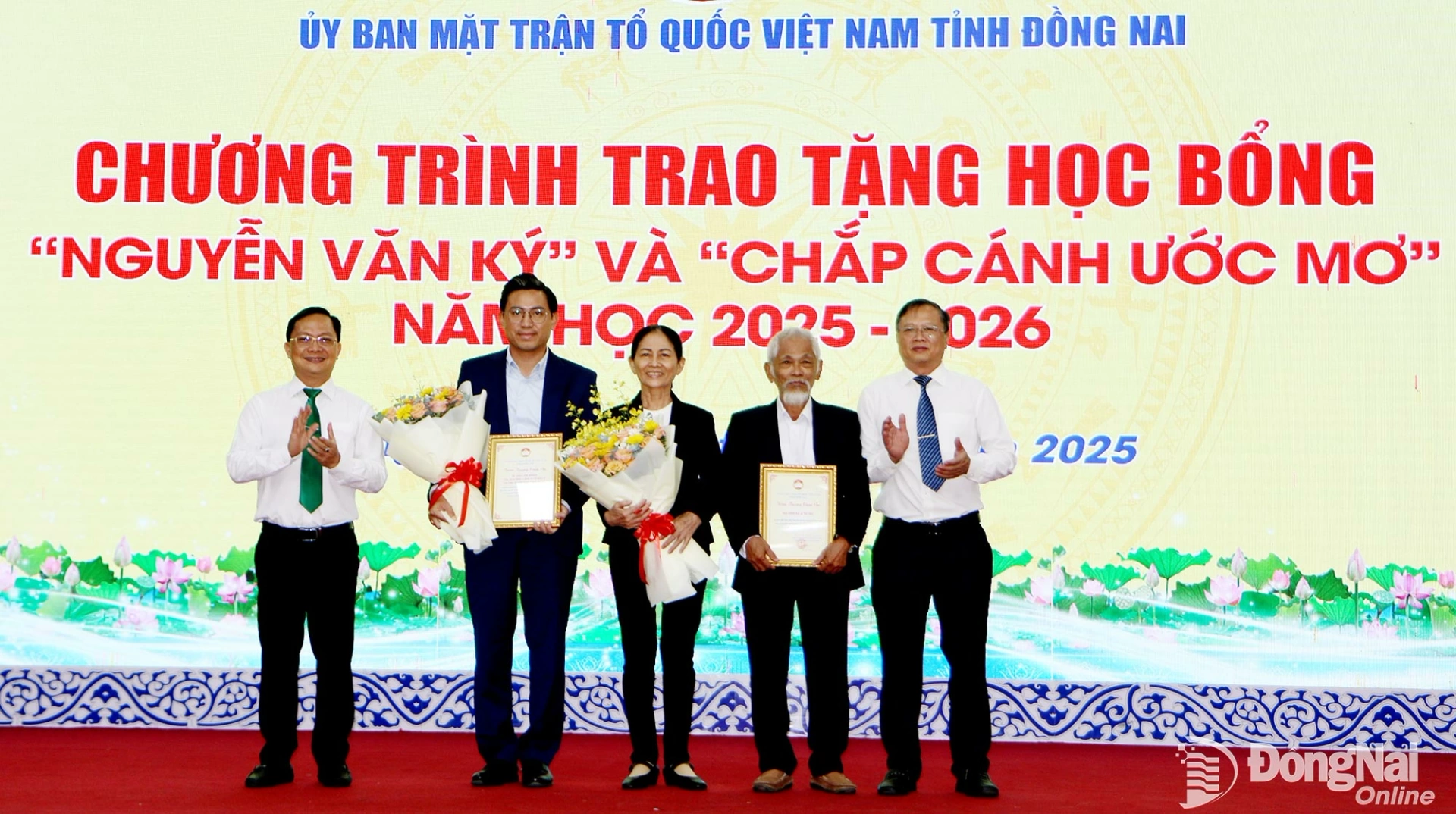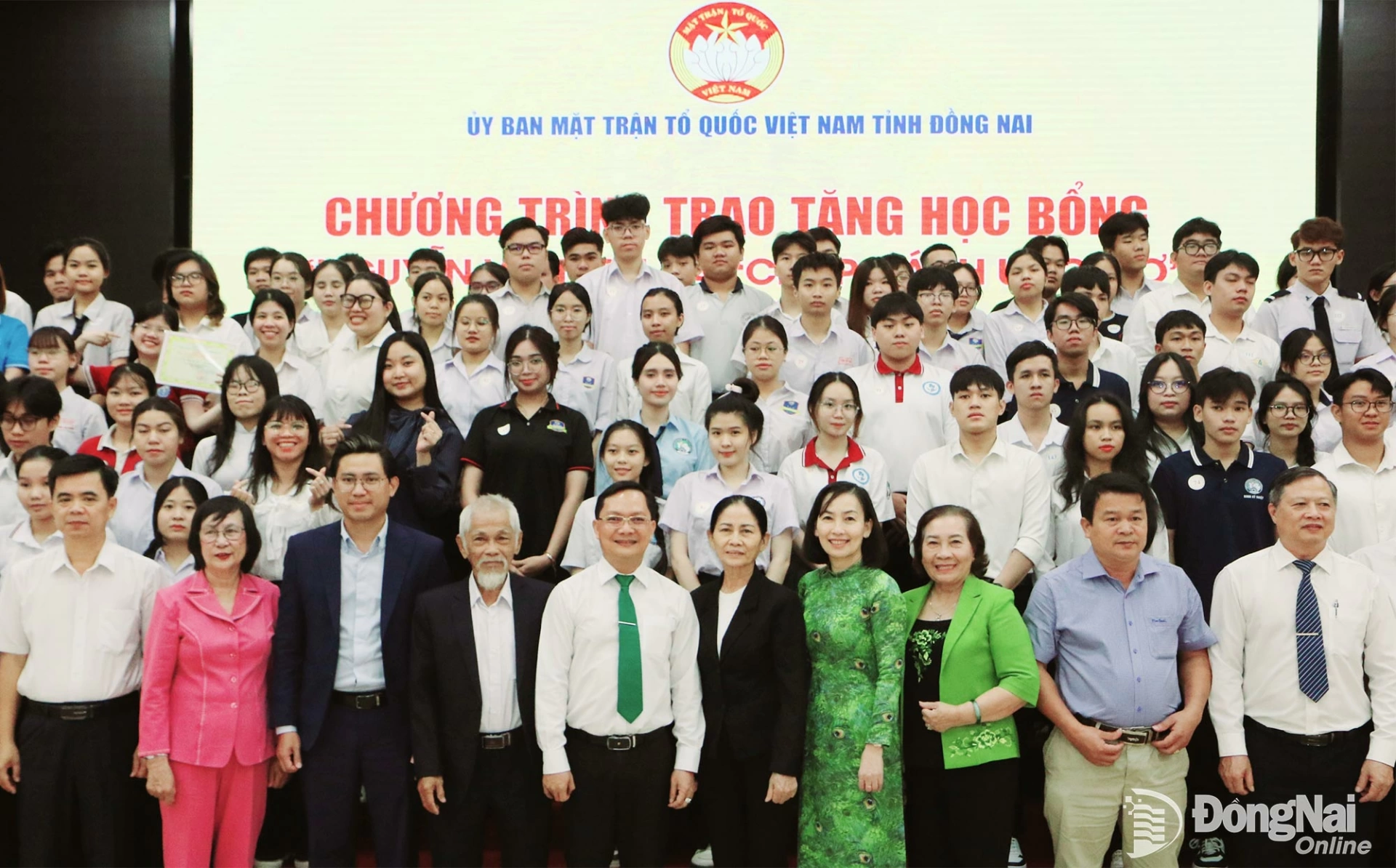 | Đồng chí Hà Anh Dũng, Ủy viên Ban Thường vụ Tỉnh ủy, Phó Chủ tịch Thường trực Ủy ban MTTQ Việt Nam tỉnh Đồng Nai cùng đại diện nhà tài trợ trao học bổng cho học sinh, sinh viên. Ảnh: Văn Truyên |