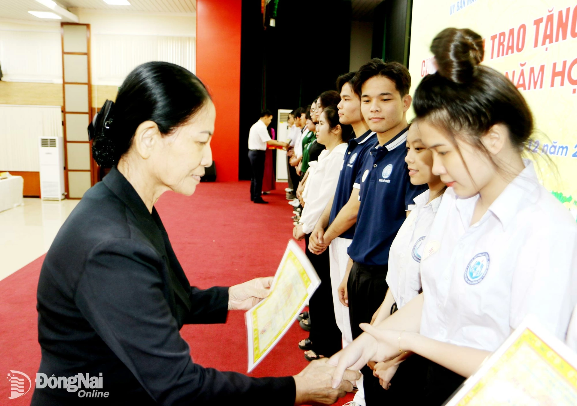 | Tỉnh ủy viên, Giám đốc Sở Giáo dục và Đào tạo tỉnh Đồng Nai Trương Thị Kim Huệ trao học bổng cho học sinh, sinh viên. Ảnh: Văn Truyên |