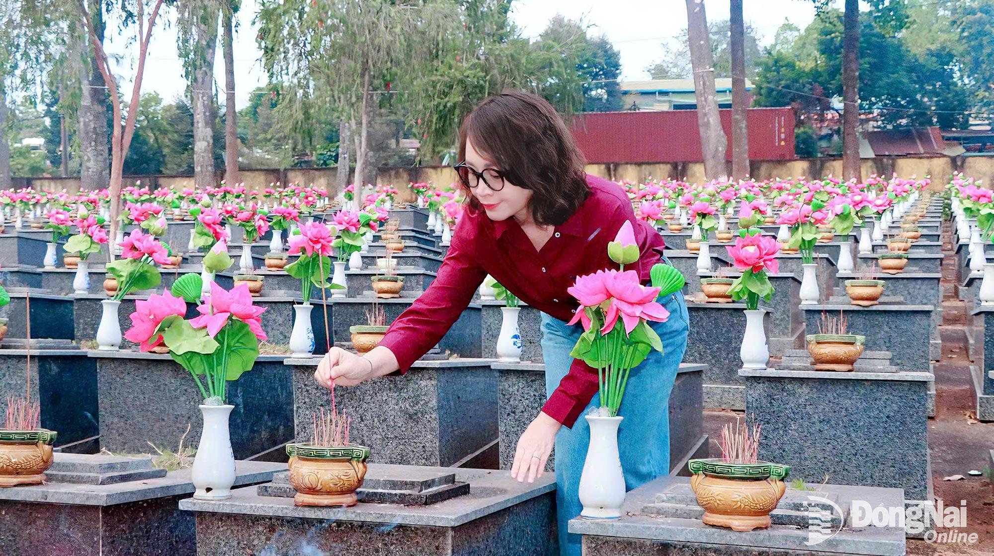 | Tỉnh ủy viên, Giám đốc Sở Văn hóa, Thể thao và Du lịch tỉnh Đồng Nai Lê Thị Ngọc Loan thắp hương viếng mộ liệt sĩ tại Nghĩa trang liệt sĩ Phước Long. Ảnh: Quang Minh |