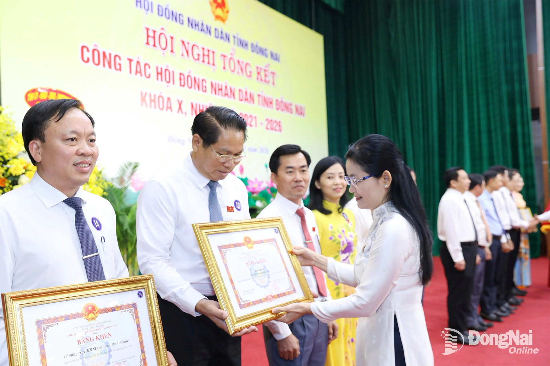 | Các đồng chí: Thái Bảo, Phó Bí thư Tỉnh ủy, Trưởng ban Tổ chức Tỉnh ủy Đồng Nai; Trần Trung Nhân, Ủy viên Ban Thường vụ Tỉnh ủy, Chủ nhiệm Ủy ban Kiểm tra Tỉnh ủy Đồng Nai trao bằng khen cho các tập thể có thành tích xuất sắc trong công tác hoạt động HĐND nhiệm kỳ 2021-2026. Ảnh: Huy Anh |