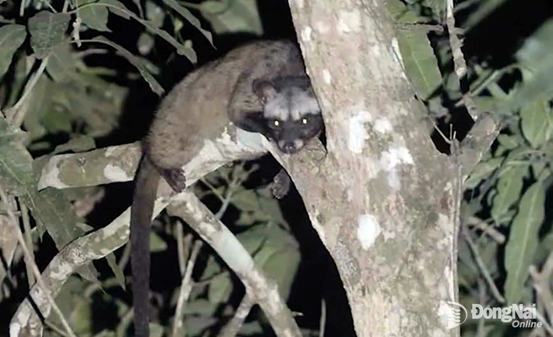 | Chú chồn hương thu mình lim dim trên cành cây giữa đêm. Ảnh: VQG Cát Tiên |