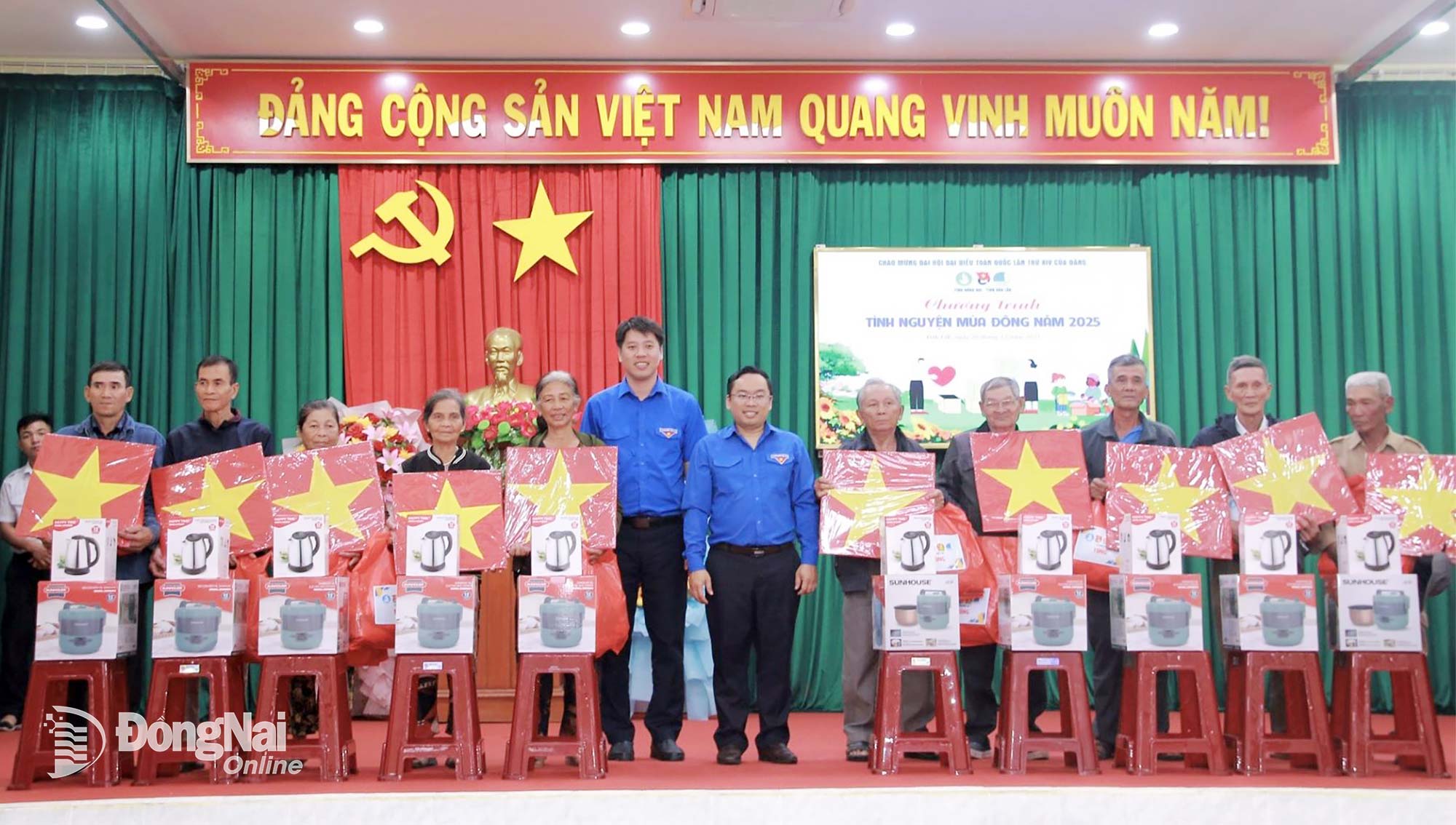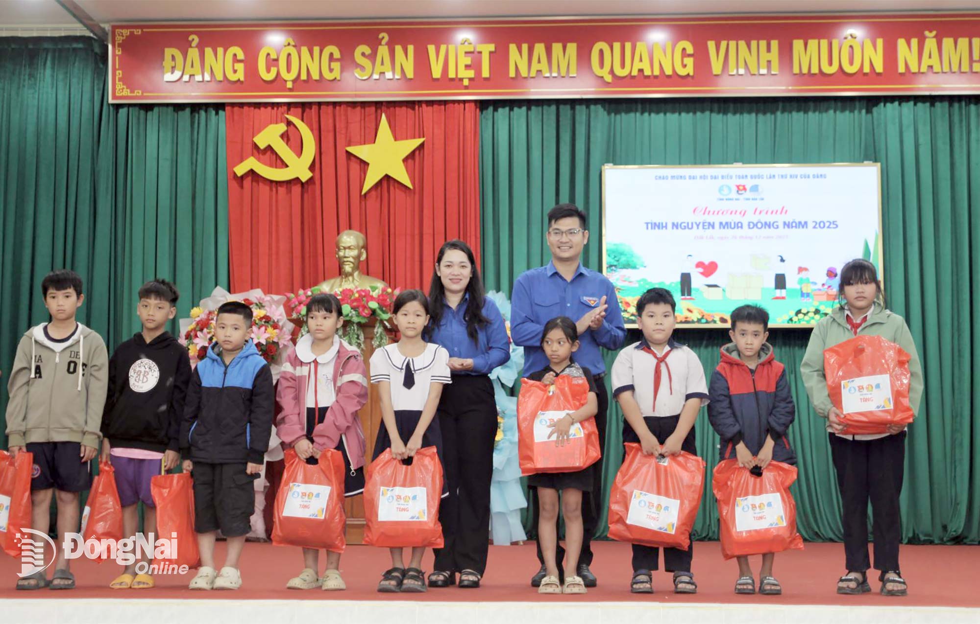 | Các Phó Bí thư Tỉnh đoàn Đồng Nai: Nguyễn Trần Phương Hà và Phan Thế Công trao quà cho các em học sinh hoàn cảnh khó khăn. Ảnh: Tỉnh đoàn cung cấp |