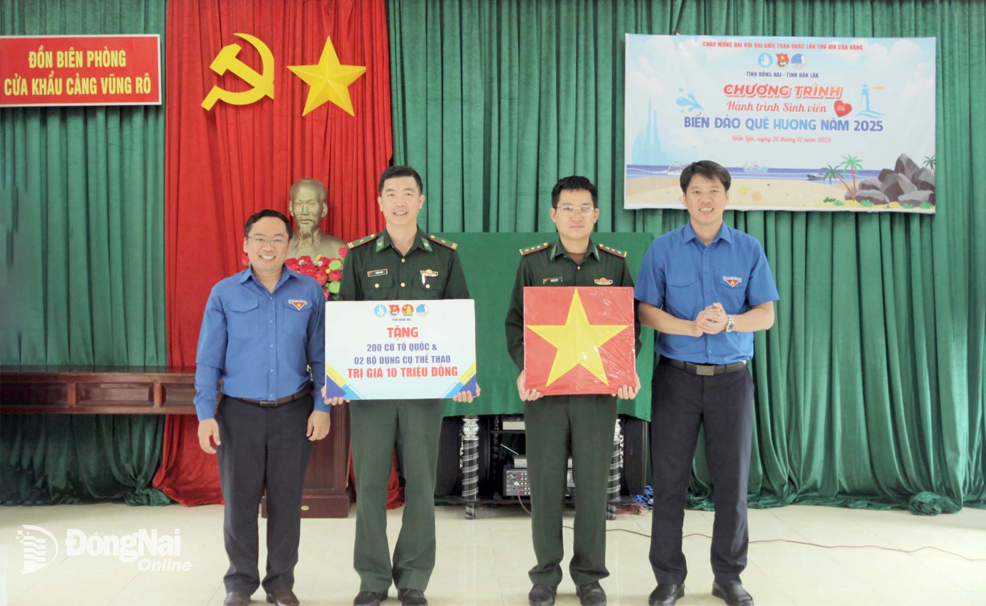 | Tỉnh ủy viên, Phó Chủ tịch Ủy ban MTTQ Việt Nam tỉnh, Bí thư Tỉnh đoàn Đồng Nai Nguyễn Minh Kiên và Phó Bí thư Tỉnh đoàn Đắk Lắk Nguyễn Thao Giang tặng quà cán bộ, chiến sĩ Đồn biên phòng cửa khẩu cảng Vũng Rô. Ảnh: Tỉnh đoàn cung cấp |
