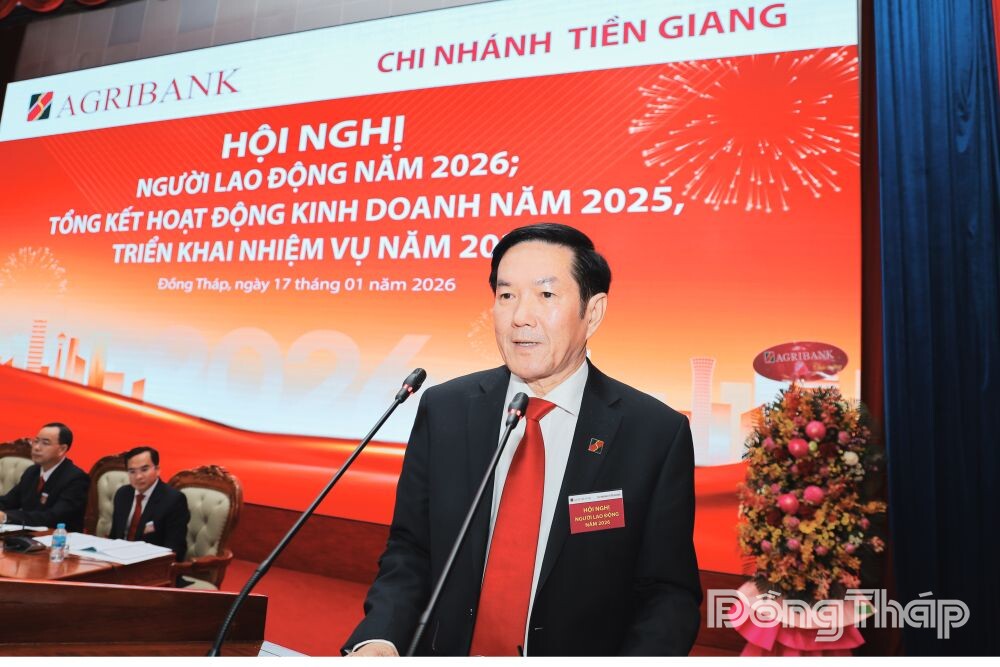 Phát biểu chỉ đạo tại Hội nghị, ông Trương Văn Đoàn, Bí thư Đảng bộ, Giám đốc Agribank chi nhánh Tiền Giang ghi nhận và biểu dương kết quả tập thể cán bộ, người lao động đã đạt được trong năm 2025. Ông nhấn mạnh, Agribank chi nhánh Tiền Giang tiếp tục giữ vai trò ngân hàng thương mại chủ lực trên địa bàn “tam nông”, bám sát kế hoạch kinh doanh, nâng cao chất lượng tín dụng, kiểm soát rủi ro, gắn tăng trưởng với hiệu quả và an toàn hoạt động.