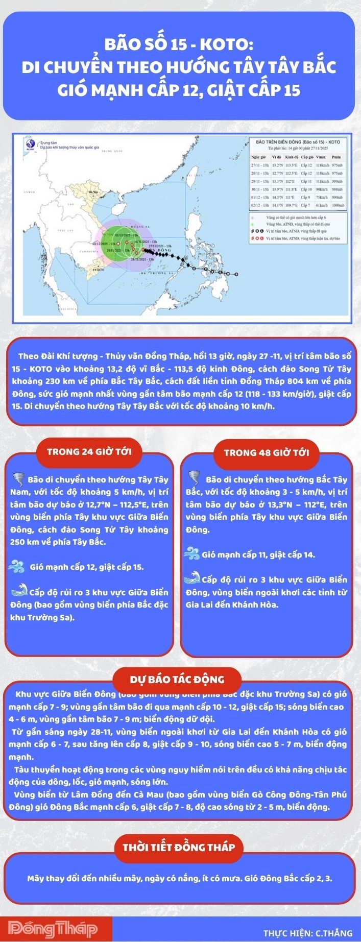 Thứ năm, 27/11/2025 | 15:46 A- A A+ | Bão số 15 - KOTO: Di chuyển theo hướng Tây Tây Bắc, sức gió mạnh cấp 12, giật cấp 15 www.baodongthap.vn Bình luận Email* Ý kiến của bạn* Nhập lại Gửi Các tin khác Sôi nổi các hoạt động chào mừng năm mới 2026 tại Công viên Tết Mậu Thân Ngân hàng Nhà nước vận hành Hệ thống thông tin giải quyết thủ tục hành chính tập trung Đồng Tháp: “Gặp gỡ kết nối cung - cầu nông sản” năm 2025 Khuyến cáo công dân di chuyển khỏi khu vực giao tranh giữa Thái Lan và Campuchia “Ba mũi giáp công” nâng chất nông thôn trong tái cơ cấu Luật Dân số: Cá nhân, cặp vợ chồng quyết định số con
