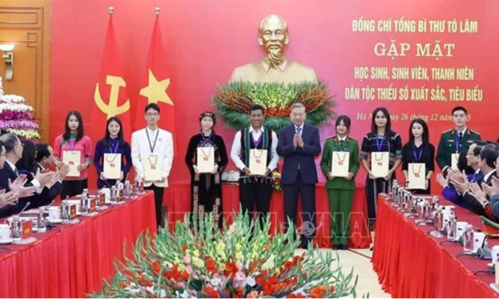 Chiều 26-12, tại trụ sở Trung ương Đảng, Tổng Bí thư Tô Lâm đã gặp mặt học sinh, sinh viên, thanh niên dân tộc thiểu số xuất sắc, tiêu biểu, đại diện cho trí tuệ, nghị lực và khát vọng vươn lên của tuổi trẻ các dân tộc thiểu số trên khắp mọi miền Tổ quốc.